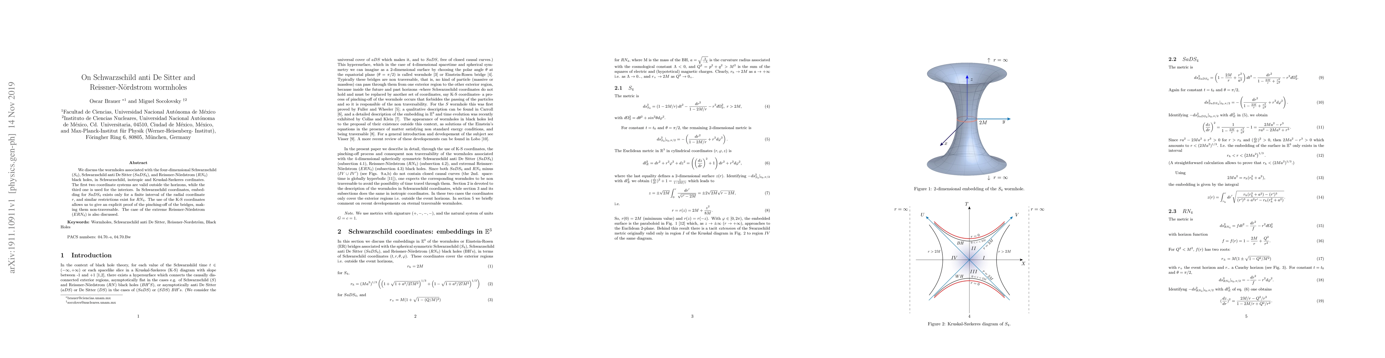 We discuss the wormholes associated with the four-dimensional Schwarzschild (S4), Schwarzschild anti De Sitter (SaDS4), and Reissner-N\"ordstrom (RN4) black holes, in Schwarzschild, isotropic and Kruskal-Szekeres cordinates. The first two coordinate systems are valid outside the horizons, while the third one is used for the interiors. In Schwarzschild coordinates, embedding for SaDS4 exists only for a finite interval of the radial coordinate r, and similar restrictions exist for RN4. The use of the K-S coordinates allows us to give an explicit proof of the pinching-off of the bridges, making them non-traversable. The case of the extreme Reissner-N\"ordstrom (ERN4) is also discussed.
