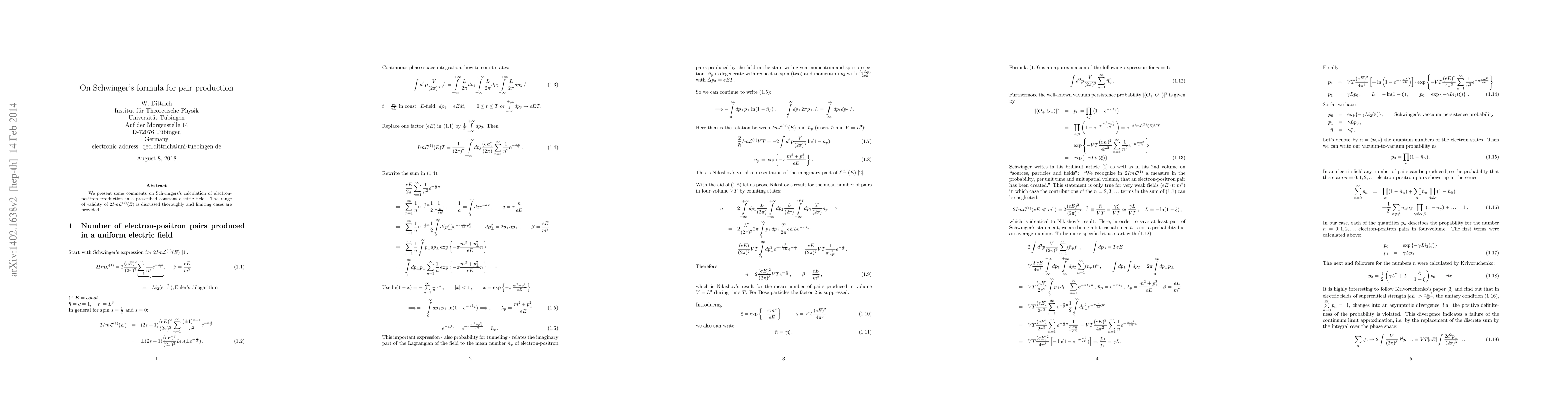 We present some comments on Schwinger's calculation of electron-positron production in a prescribed constant electric field. The range of validity of 2 Im \mathcal{L}^(1)(E) is discussed thoroughly and limiting cases are provided.