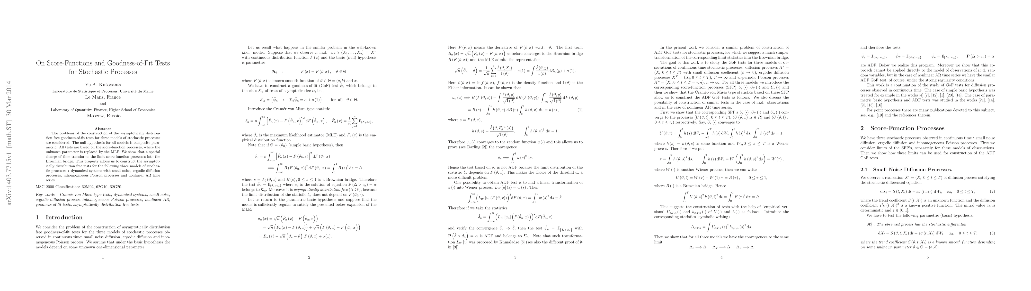 The problems of the construction of the asymptotically distribution free goodness-of-fit tests for three models of stochastic processes are considered. The null hypothesis for all models is composite parametric. All tests are based on the score-function processes, where the unknown parameter is replaced by the MLE. We show that a special change of time transforms the limit score-function processes into the Brownian bridge. This property allows us to construct the asymptotically distribution free tests for the following three models of stochastic processes : dynamical systems with small noise, ergodic diffusion processes, inhomogeneous Poisson processes and nonlinear AR time series.