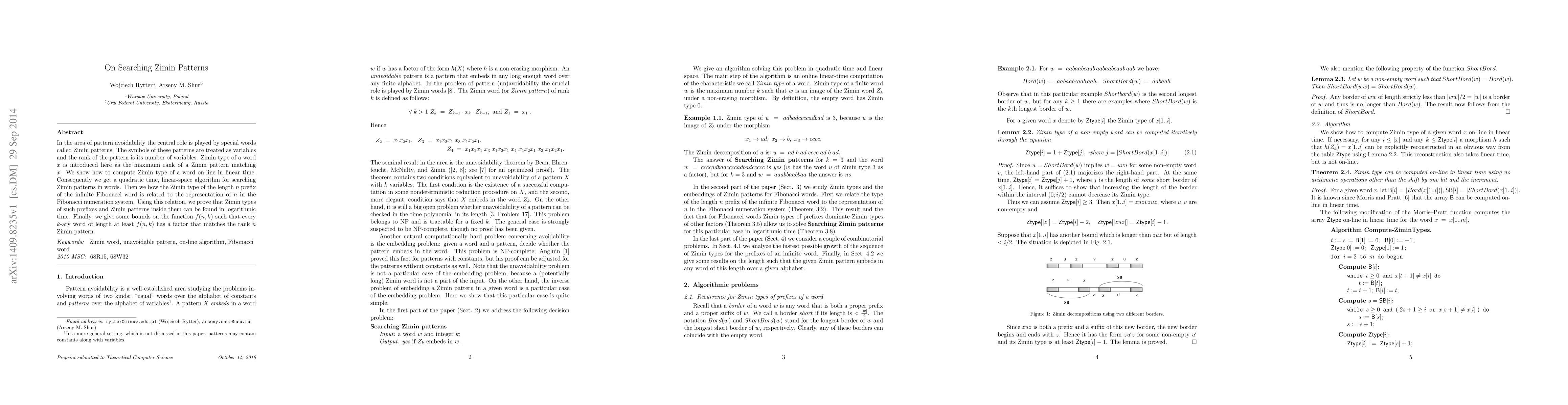 This paper introduces a method to compute Zimin type in linear time, leading to a quadratic algorithm for searching Zimin patterns in words, and provides bounds on the function related to matching ranks within Fibonacci numeration system.