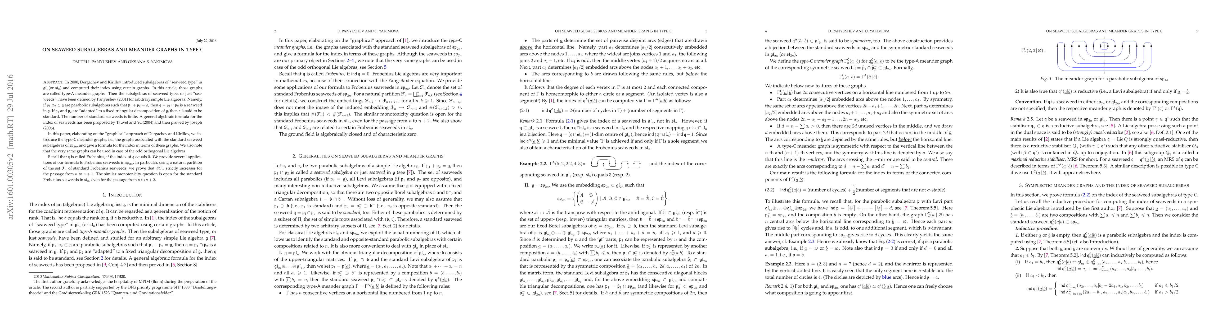 In 2000, Dergachev and Kirillov introduced subalgebras of "seaweed type" in $\mathfrak{gl}(n)$ and computed their index using certain graphs. In this article, those graphs are called type-A meander graphs. Then the subalgebras of seaweed type, or just "seaweeds", have been defined by Panyushev (2001) for arbitrary simple Lie algebras. Namely, if $\mathfrak p_1,\mathfrak p_2\subset\mathfrak g$ are parabolic subalgebras such that $\mathfrak p_1+\mathfrak p_2=\mathfrak g$, then $\mathfrak q=\mathfrak p_1\cap\mathfrak p_2$ is a seaweed in $\mathfrak g$. A general algebraic formula for the index of seaweeds has been proposed by Tauvel and Yu (2004) and then proved by Joseph (2006). If $\mathfrak p_1$ and $\mathfrak p_2$ are "adapted" to a fixed triangular decomposition of $\mathfrak g$, then $\mathfrak q$ is said to be standard. The number of standard seaweeds is finite. In this paper, elaborating on the "graphical" approach of Dergachev and Kirillov, we introduce the type-C meander graphs, i.e., the graphs associated with the standard seaweeds of $\mathfrak{sp}(2n)$, and give a formula for the index in terms of these graphs. We also note that the very same graphs can be used in case of the odd orthogonal Lie algebras. We also provide several applications of our formula to the Frobenius seaweeds in $\mathfrak{sp}(2n)$. In particular, using a natural partition of the set $\mathcal F_n$ of standard Frobenius seaweeds, we prove that $\# \mathcal F_n$ strictly increases for the passage from $n$ to $n+1$. The similar monotonicity question is open for the standard Frobenius seaweeds in $\mathfrak{sl}(n)$, even for the passage from $n$ to $n+2$.
