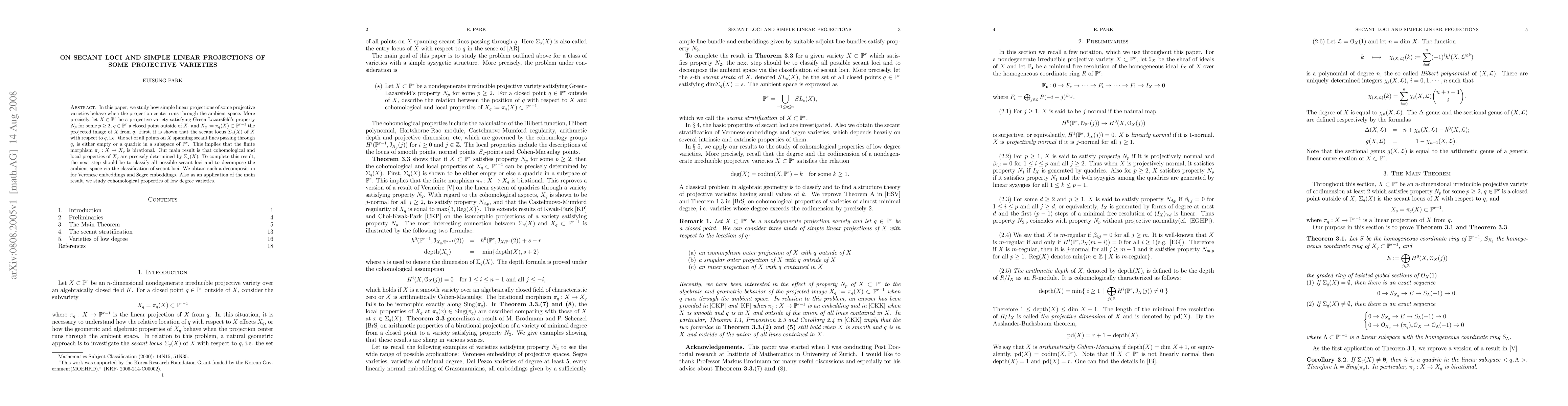 In this paper, we study how simple linear projections of some projective varieties behave when the projection center runs through the ambient space. More precisely, let $X \subset \P^r$ be a projective variety satisfying Green-Lazarsfeld's property $N_p$ for some $p \geq 2$, $q \in \P^r$ a closed point outside of $X$, and $X_q := \pi_q (X) \subset \P^{r-1}$ the projected image of $X$ from $q$. First, it is shown that the secant locus $\Sigma_q (X)$ of $X$ with respect to $q$, i.e. the set of all points on $X$ spanning secant lines passing through $q$, is either empty or a quadric in a subspace of $\P^r$. This implies that the finite morphism $\pi_q : X \to X_q$ is birational. Our main result is that cohomological and local properties of $X_q$ are precisely determined by $\Sigma_q (X)$. To complete this result, the next step should be to classify all possible secant loci and to decompose the ambient space via the classification of secant loci. We obtain such a decomposition for Veronese embeddings and Segre embeddings. Also as an application of the main result, we study cohomological properties of low degree varieties.