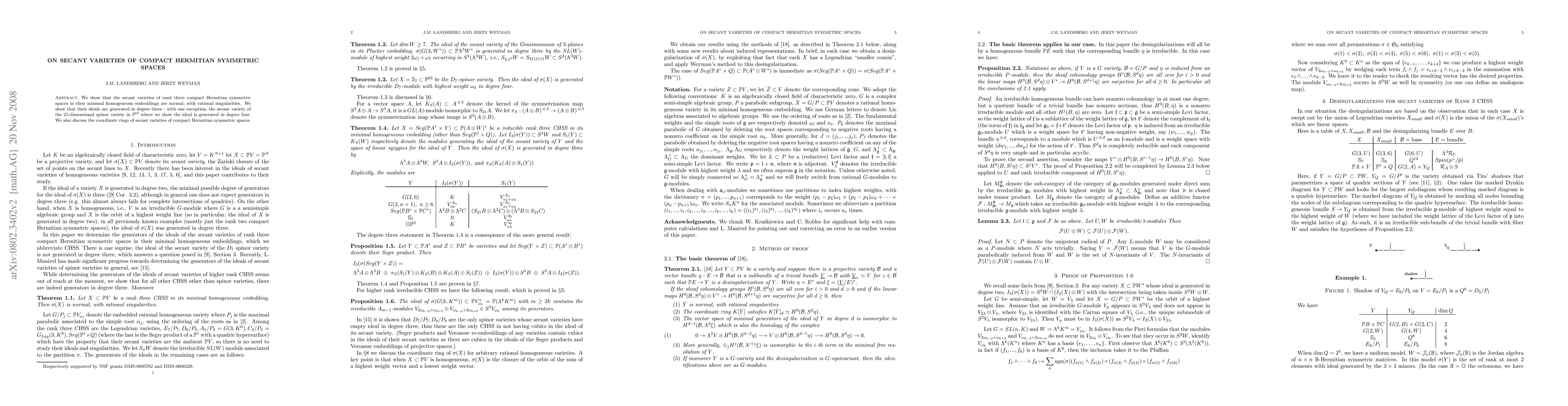 We show that the secant varieties of rank three compact Hermitian symmetric spaces in their minimal homogeneous embeddings are normal, with rational singularities. We show that their ideals are generated in degree three - with one exception, the secant variety of the $21$-dimensional spinor variety in $\pp{63}$ where we show the ideal is generated in degree four. We also discuss the coordinate rings of secant varieties of compact Hermitian symmetric spaces.