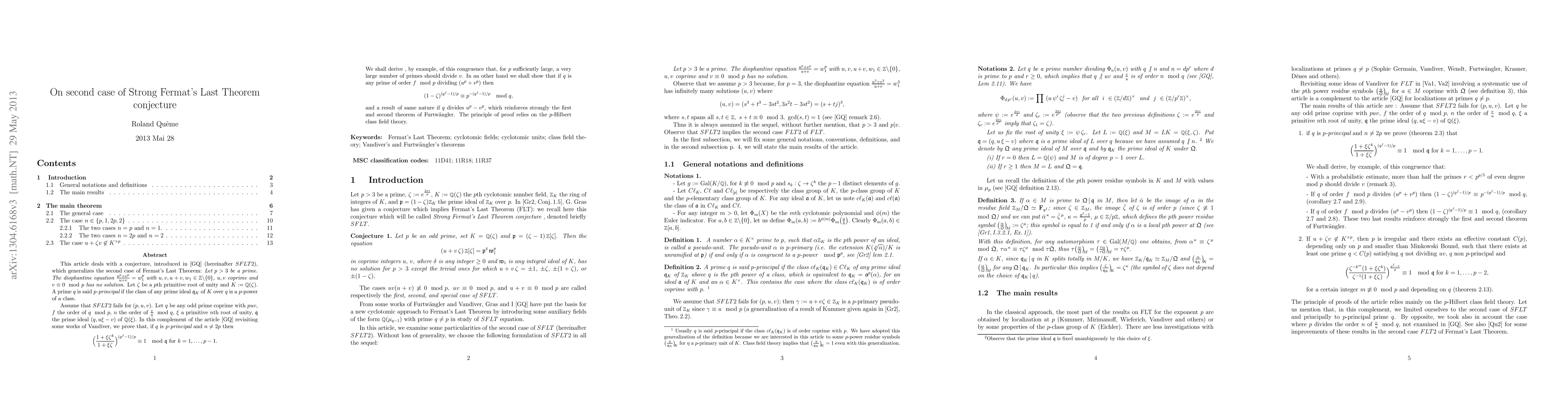 This article deals with a conjecture, introduced in [GQ] (hereinafter $SFLT2$), which generalizes the second case of Fermat's Last Theorem: {\it Let $p>3$ be a prime. The diophantine equation $\frac{u^p+v^p}{u+v}=w_1^p$ with $u,v,u+v, w_1\in\Z\backslash\{0\}$, $u,v$ coprime and $v\equiv 0 \mod p$ has no solution.} Let $\zeta$ be a $p$th primitive root of unity and $K:=\Q(\zeta)$. A prime $q$ is said {\it $p$-principal} if the class of any prime ideal $\mathfrak q_K$ of $K$ over $q$ is a $p$-power of a class. Assume that $SFLT2$ fails for $(p,u,v)$. Let $q$ be any odd prime coprime with $puv$, $f$ the order of $q\mod p$, $n$ the order of $\frac{v}{u}\mod q$, $\xi$ a primitive $n$th root of unity, $\mathfrak q$ the prime ideal $(q,u\xi-v)$ of $\Q(\xi)$. In this complement of the article [GQ] revisiting some works of Vandiver, we prove that, if $q$ is {\it $p$-principal} and $n\not=2p$ then $$\Big(\frac{1+\xi\zeta^k}{1+\xi\zeta}\Big)^{(q^f-1)/p}\equiv 1\mod \mathfrak q for k=1,\dots,p-1.$$ We shall derive, by example, of this congruence that, for $p$ sufficiently large, a very large number of primes should divide $v$. In an other hand we shall show that if $q$ is any prime of order $f\mod p$ dividing $(u^p+v^p)$ then $$(1-\zeta)^{(q^f-1)/p}\equiv p^{-(q^f-1)/p}\mod q, $$ and a result of same nature if $q$ divides $u^p-v^p$, which reinforces strongly the first and second theorem of Furtw\"angler. The principle of proof relies on the $p$-Hilbert class field theory. Keywords: Fermat's Last Theorem; cyclotomic fields; cyclotomic units; class field theory; Vandiver's and Furtw\"angler's theorems