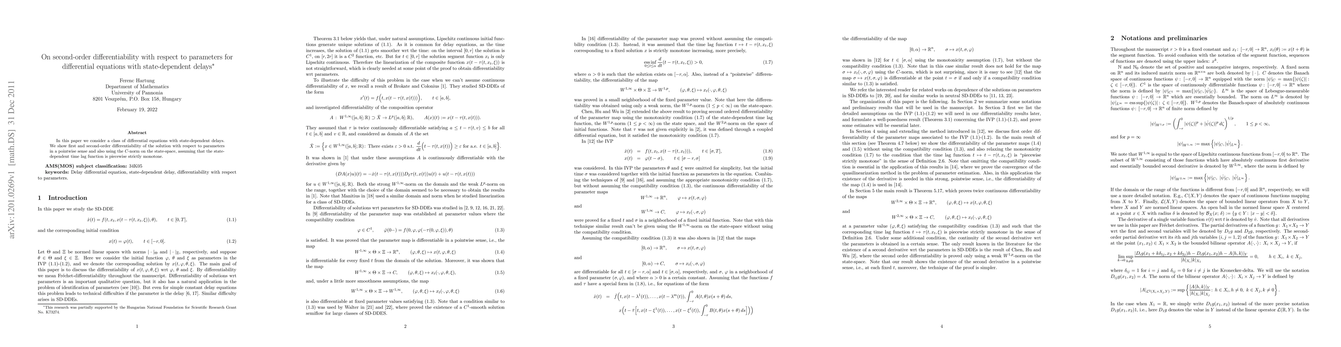 In this paper we consider a class of differential equations with state-dependent delays. We show first and second-order differentiability of the solution with respect to parameters in a pointwise sense and also using the C-norm on the state-space, assuming that the state-dependent time lag function is piecewise strictly monotone.
