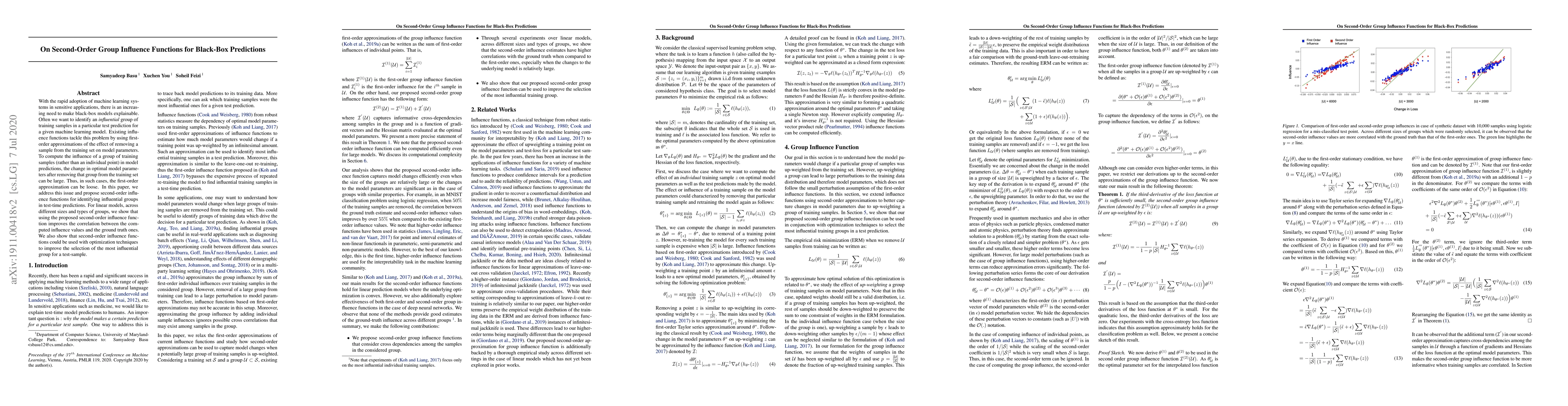 With the rapid adoption of machine learning systems in sensitive applications, there is an increasing need to make black-box models explainable. Often we want to identify an influential group of training samples in a particular test prediction for a given machine learning model. Existing influence functions tackle this problem by using first-order approximations of the effect of removing a sample from the training set on model parameters. To compute the influence of a group of training samples (rather than an individual point) in model predictions, the change in optimal model parameters after removing that group from the training set can be large. Thus, in such cases, the first-order approximation can be loose. In this paper, we address this issue and propose second-order influence functions for identifying influential groups in test-time predictions. For linear models, across different sizes and types of groups, we show that using the proposed second-order influence function improves the correlation between the computed influence values and the ground truth ones. We also show that second-order influence functions could be used with optimization techniques to improve the selection of the most influential group for a test-sample.