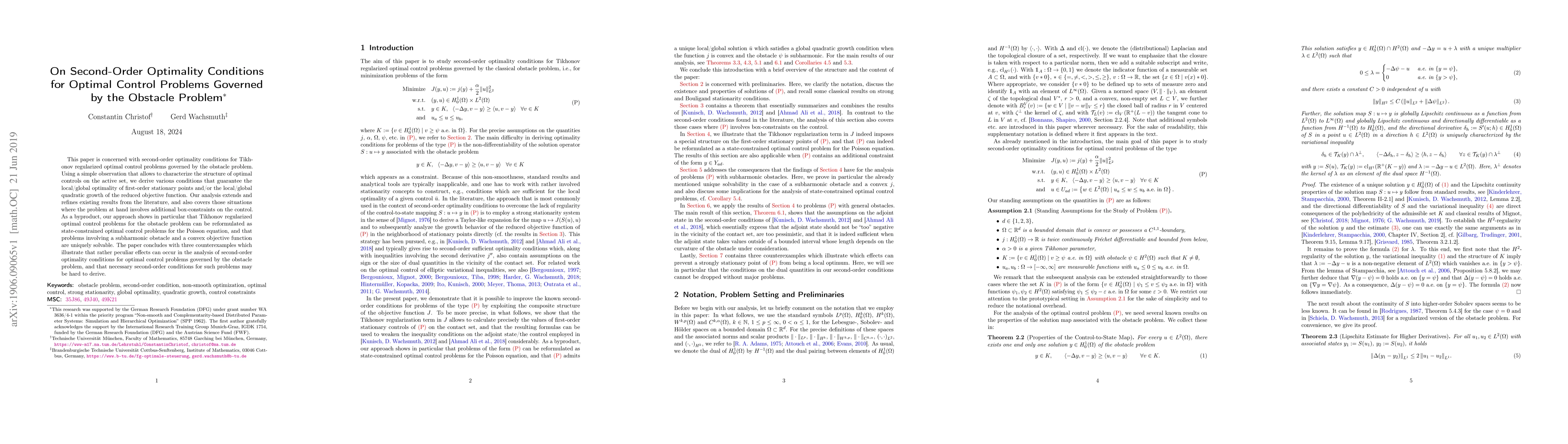 This paper derives second-order optimality conditions for Tikhonov regularized optimal control problems constrained by the obstacle problem, showing how they can be reformulated as state-constrained problems for the Poisson equation, and discussing the uniqueness of solutions under certain conditions. It also presents counterexamples highlighting complexities in deriving necessary second-order conditions.