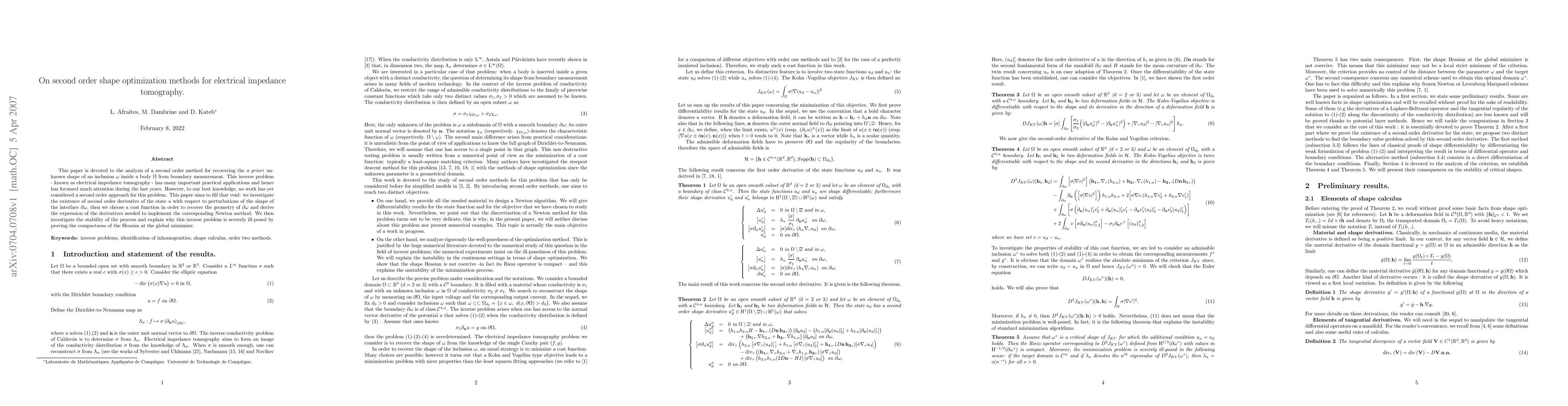 Researchers developed a second-order shape optimization method for electrical impedance tomography to recover the shape of an inclusion inside a body from boundary measurements. They also proved that the inverse problem is severely ill-posed due to instability in the Hessian matrix.