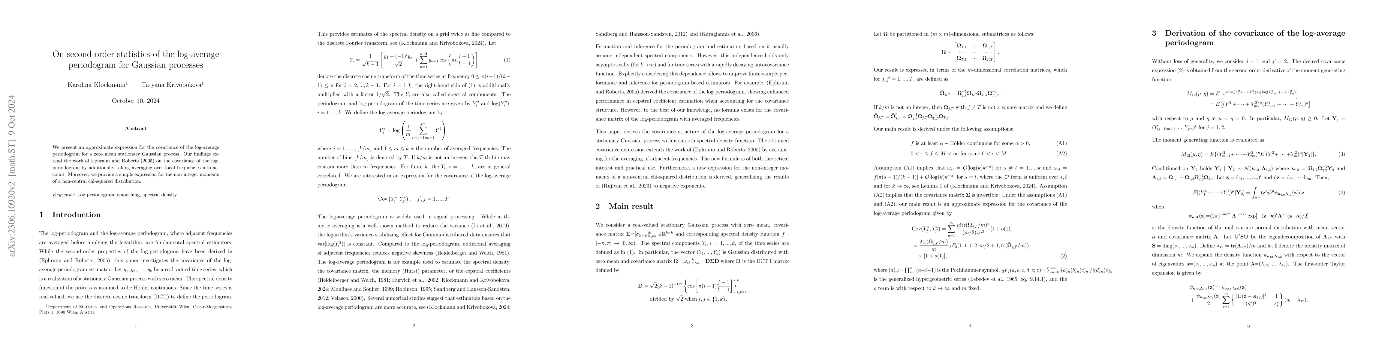 This paper derives an approximate expression for the covariance of the log-average periodogram for zero mean stationary Gaussian processes, extending Ephraim and Roberts' work by incorporating averaging over local frequencies. It also provides a simple expression for non-integer moments of a non-central chi-squared distribution.