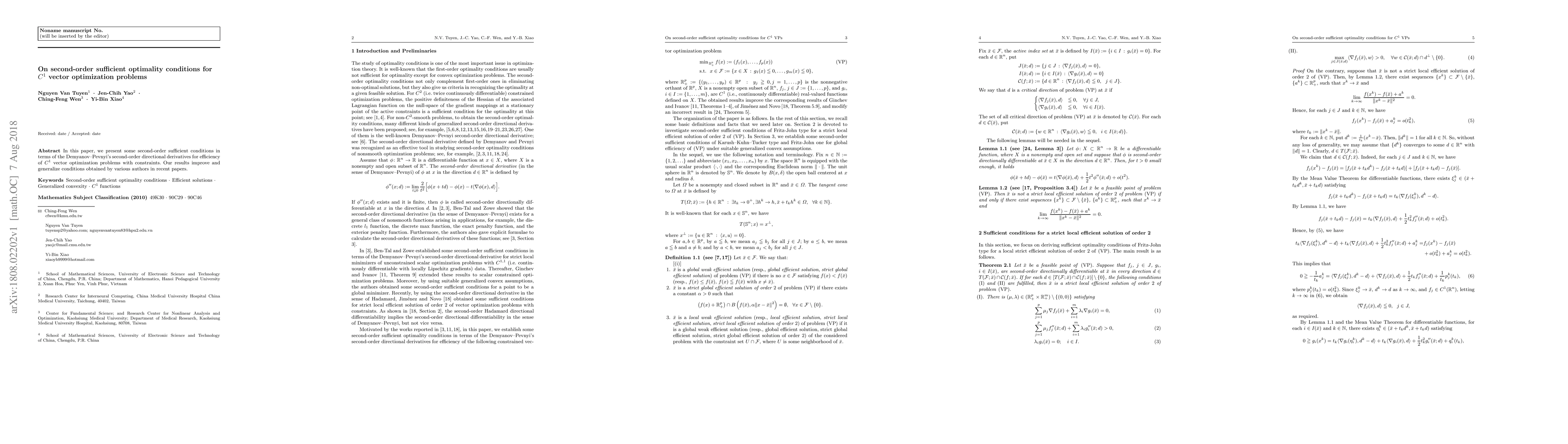 This paper introduces second-order sufficient conditions for efficiency in $C^1$ vector optimization problems using Demyanov-Pevnyi's second-order directional derivatives, improving and generalizing previous results from other studies.
