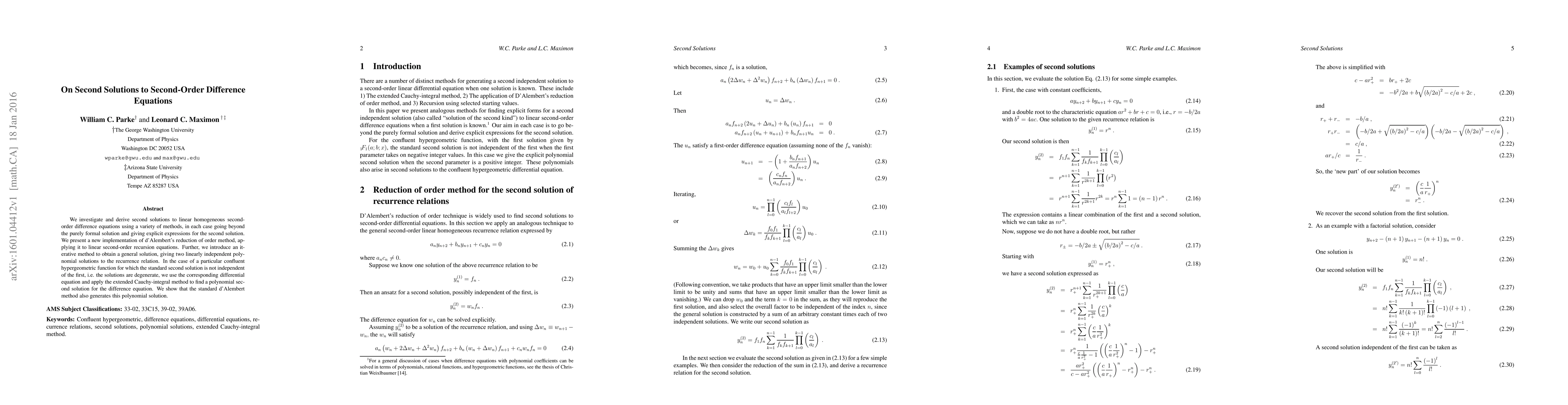We investigate and derive second solutions to linear homogeneous second-order difference equations using a variety of methods, in each case going beyond the purely formal solution and giving explicit expressions for the second solution. We present a new implementation of d'Alembert's reduction of order method, applying it to linear second-order recursion equations. Further, we introduce an iterative method to obtain a general solution, giving two linearly independent polynomial solutions to the recurrence relation. In the case of a particular confluent hypergeometric function for which the standard second solution is not independent of the first, i.e. the solutions are degenerate, we use the corresponding differential equation and apply the extended Cauchy-integral method to find a polynomial second solution for the difference equation. We show that the standard d'Alembert method also generates this polynomial solution.
