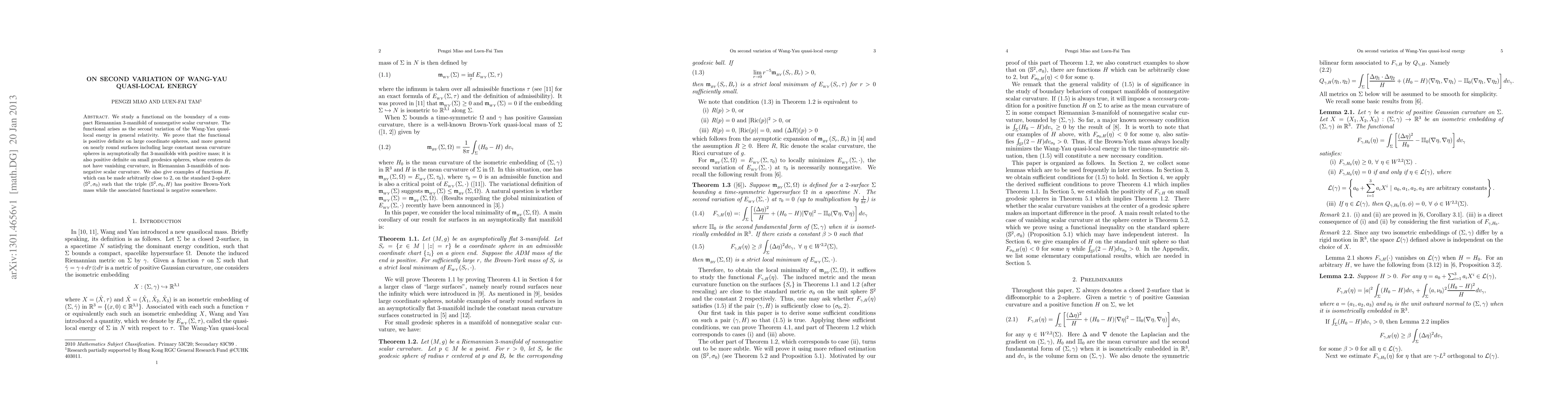We study a functional on the boundary of a compact Riemannian 3-manifold of nonnegative scalar curvature. The functional arises as the second variation of the Wang-Yau quasi-local energy in general relativity. We prove that the functional is positive definite on large coordinate spheres, and more general on nearly round surfaces including large constant mean curvature spheres in asymptotically flat 3-manifolds with positive mass; it is also positive definite on small geodesics spheres, whose centers do not have vanishing curvature, in Riemannian 3-manifolds of nonnegative scalar curvature. We also give examples of functions H, which can be made arbitrarily close to the constant 2, on the standard sphere such that the boundary data consisting of the standard spherical metric and H has positive Brown-York mass while the associated functional is negative somewhere.
