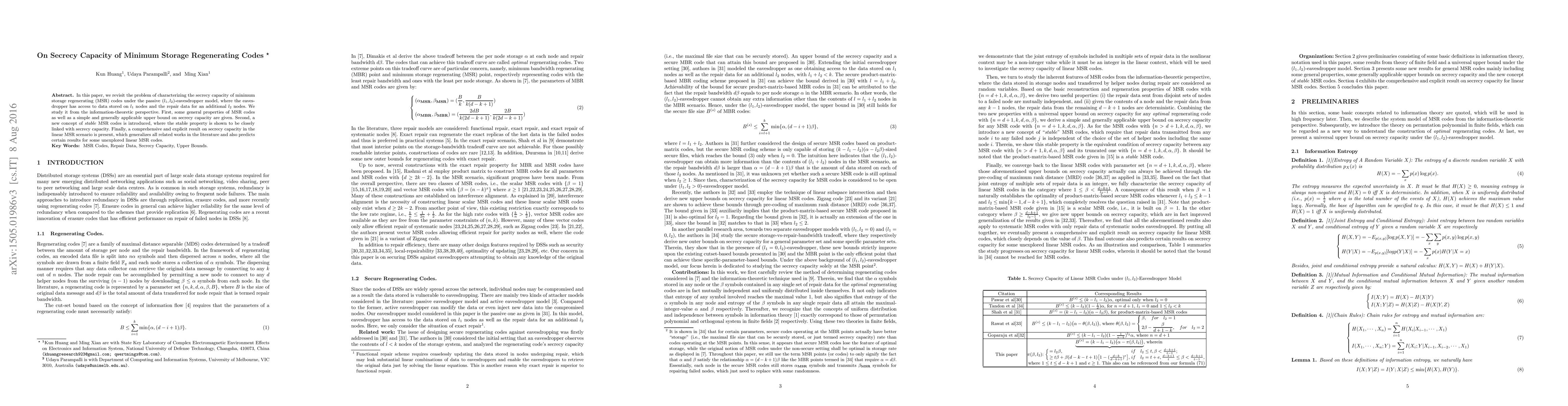 In this paper, we revisit the problem of characterizing the secrecy capacity of minimum storage regenerating (MSR) codes under the passive $(l_1,l_2)$-eavesdropper model, where the eavesdropper has access to data stored on $l_1$ nodes and the repair data for an additional $l_2$ nodes. We study it from the information-theoretic perspective. First, some general properties of MSR codes as well as a simple and generally applicable upper bound on secrecy capacity are given. Second, a new concept of \emph{stable} MSR codes is introduced, where the stable property is shown to be closely linked with secrecy capacity. Finally, a comprehensive and explicit result on secrecy capacity in the linear MSR scenario is present, which generalizes all related works in the literature and also predicts certain results for some unexplored linear MSR codes.