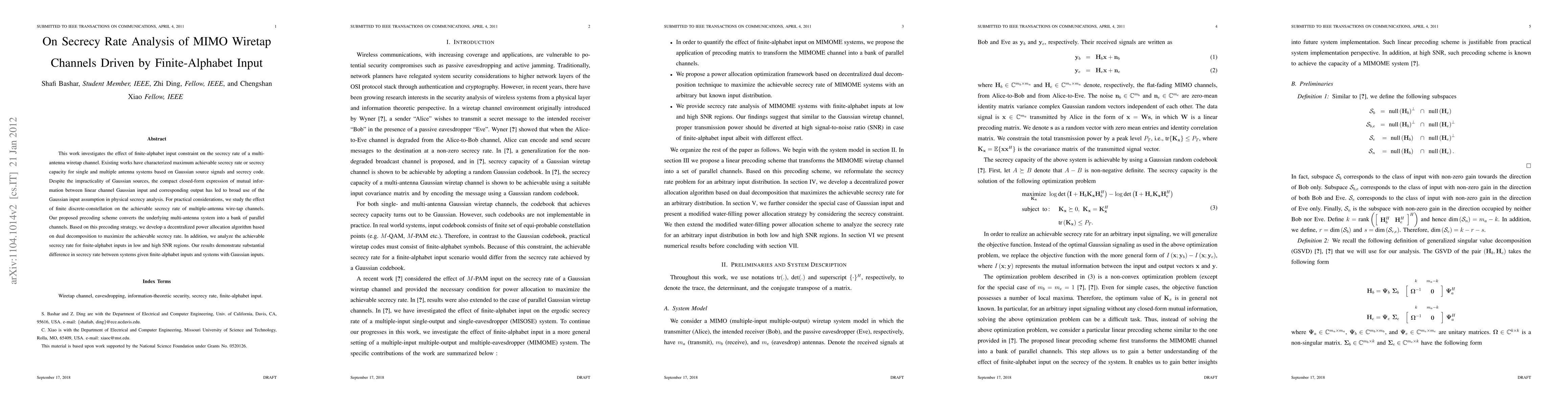 This paper examines the impact of finite-alphabet inputs on the secrecy rate of multi-antenna wiretap channels, proposing a precoding scheme and decentralized power allocation algorithm to maximize the achievable secrecy rate. It reveals significant differences in secrecy rate between systems with finite-alphabet inputs versus Gaussian inputs.