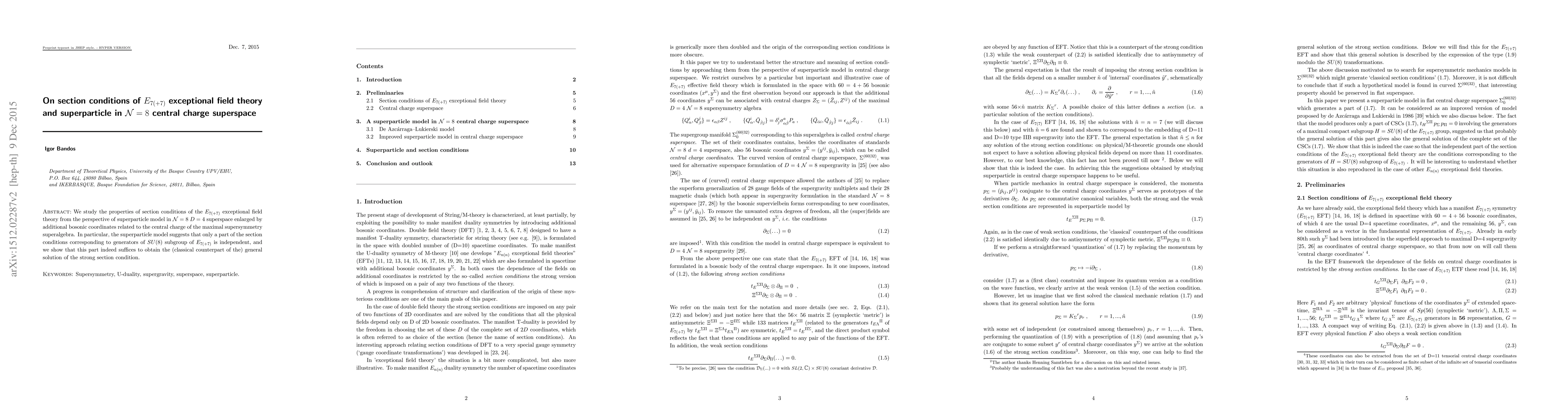 This paper investigates the section conditions of E7(7) exceptional field theory through the lens of an N=8 D=4 superparticle model, revealing that only a subset of these conditions, tied to the SU(8) subgroup of E7(7), is independently necessary to derive the general solution of the strong section condition.