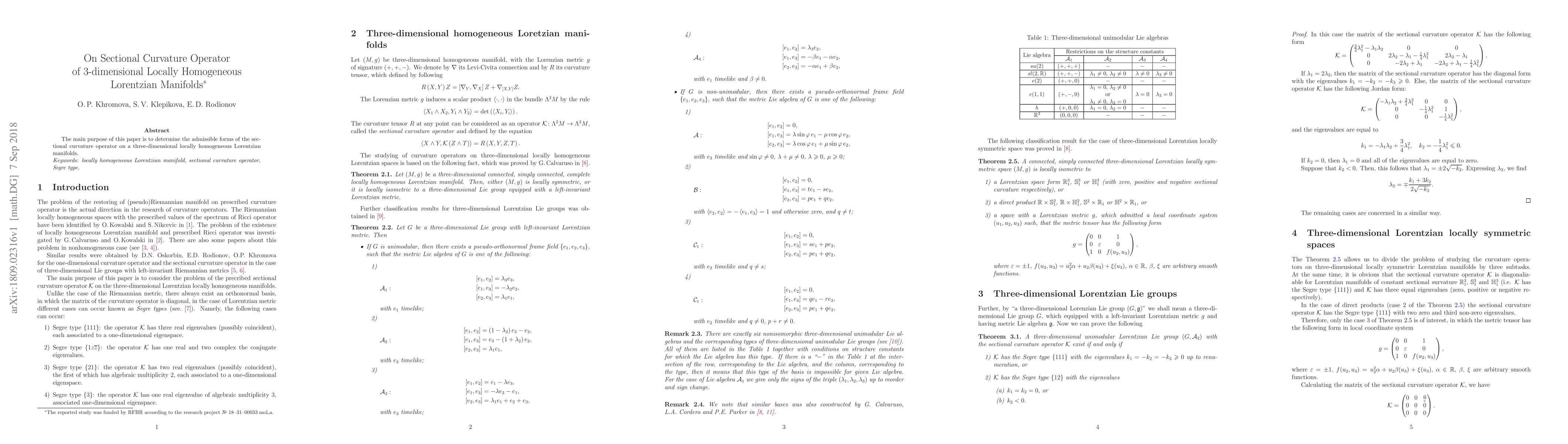 Summary: This paper identifies the permissible forms of the sectional curvature operator in three-dimensional locally homogeneous Lorentzian manifolds, providing significant insights into their geometric properties. The findings advance the understanding of the intrinsic curvature characteristics of such manifolds.