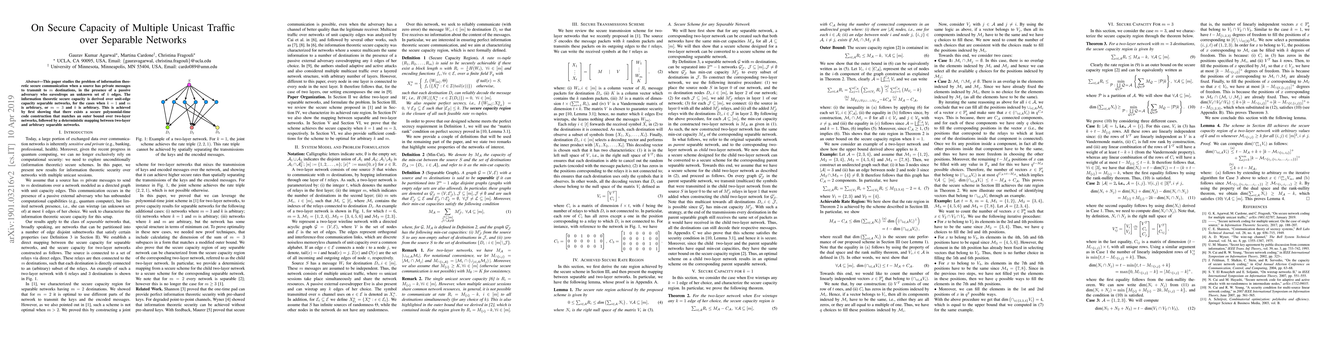 This paper studies the problem of information theoretic secure communication when a source has private messages to transmit to $m$ destinations, in the presence of a passive adversary who eavesdrops an unknown set of $k$ edges. The information theoretic secure capacity is derived over unit-edge capacity separable networks, for the cases when $k=1$ and $m$ is arbitrary, or $m=3$ and $k$ is arbitrary. This is achieved by first showing that there exists a secure polynomial-time code construction that matches an outer bound over two-layer networks, followed by a deterministic mapping between two-layer and arbitrary separable networks.
