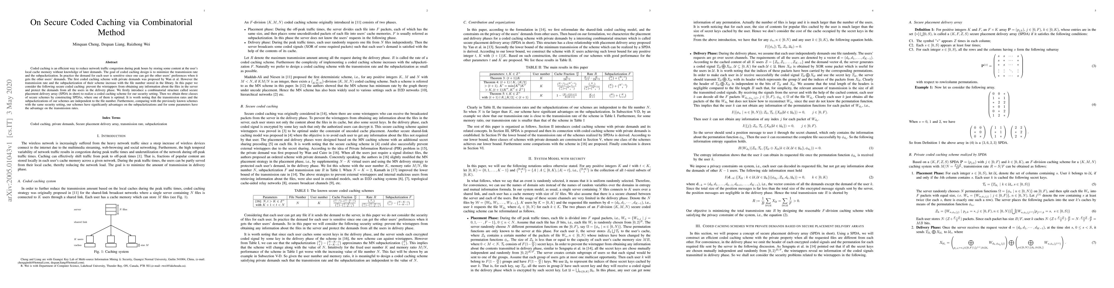 The paper introduces a combinatorial structure called Secure Placement Delivery Array (SPDA) to design coded caching schemes that ensure security by preventing wiretappers from gaining information about files and protecting user demands during the delivery phase.