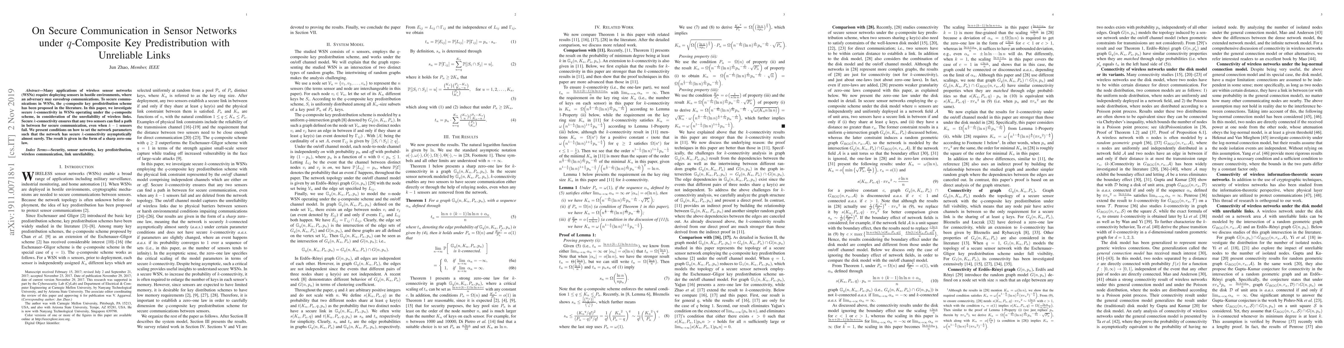 This paper explores secure k-connectivity in wireless sensor networks using the q-composite key predistribution scheme, considering unreliable communication links. It provides conditions for network parameters to ensure secure k-connectivity asymptotically almost surely, with a sharp zero-one law.