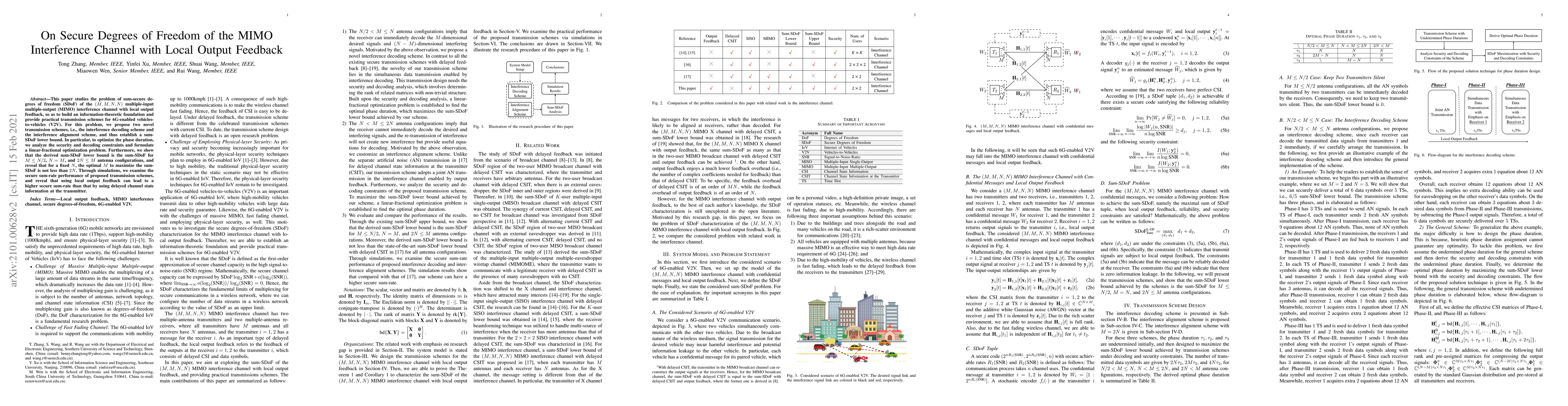 This paper studies the problem of sum-secure degrees of freedom (SDoF) of the (M,M,N,N) multiple-input multiple-output (MIMO) interference channel with local output feedback, so as to build an information-theoretic foundation and provide practical transmission schemes for 6G-enabled vehicles-to-vehicles (V2V). For this problem, we propose two novel transmission schemes, i.e., the interference decoding scheme and the interference alignment scheme, and thus establish a sum-SDoF lower bound. In particular, to optimize the phase duration, we analyze the security and decoding constraints and formulate a linear-fractional optimization problem. Furthermore, we show that the derived sum-SDoF lower bound is the sum-SDoF for M <= N/2, N=M, and 2N <= M antenna configurations, and reveal that for a fixed N, the optimal M to maximize the sum-SDoF is not less than 2N. Through simulations, we examine the secure sum-rate performance of proposed transmission schemes, and reveal that using local output feedback can lead to a higher secure sum-rate than that by using delayed channel state information at the transmitter.