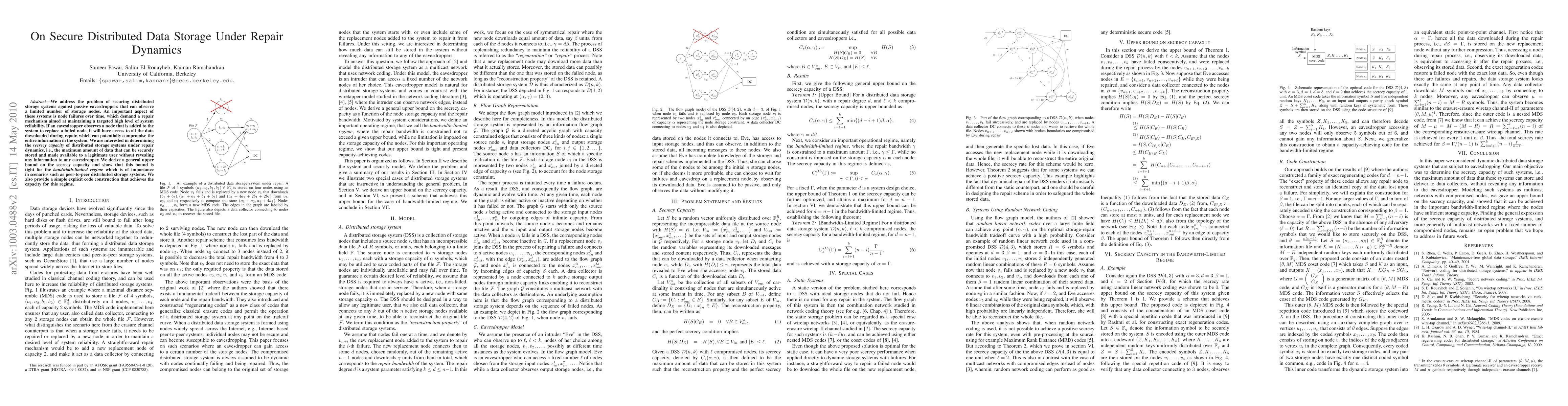 This paper investigates securing distributed storage systems against passive eavesdroppers, focusing on the challenge of maintaining data secrecy during repair processes following node failures. The authors derive an upper bound on the secrecy capacity and demonstrate its tightness under bandwidth-limited conditions, providing an explicit code construction that achieves this capacity.