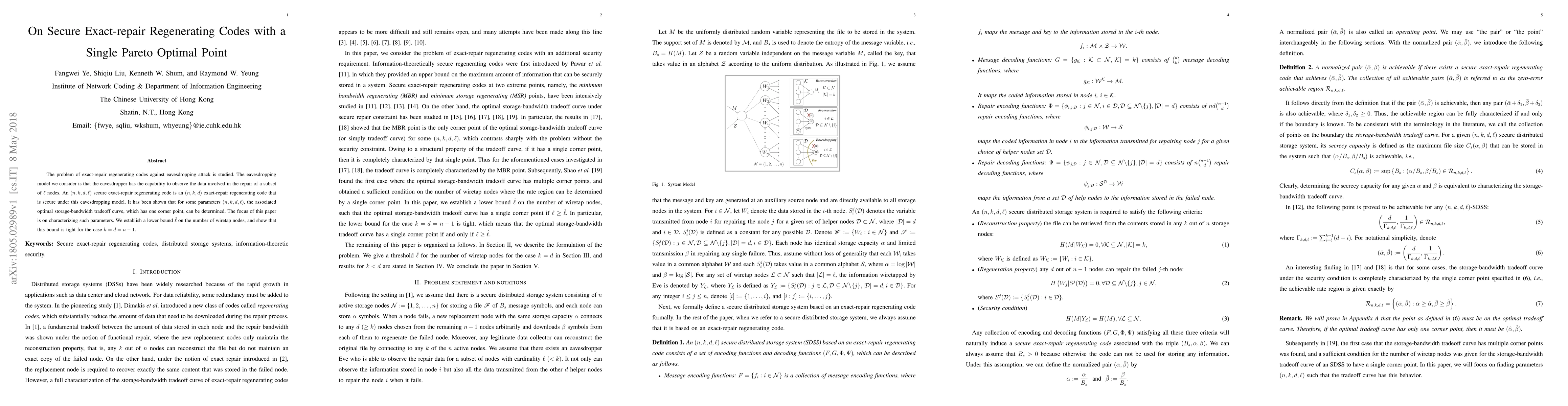 This paper investigates secure exact-repair regenerating codes under an eavesdropping model where the attacker observes data during node repair. It characterizes parameters for which the optimal storage-bandwidth tradeoff curve has a single Pareto optimal point, establishing a tight lower bound on the number of wiretap nodes when $k = d = n-1$.