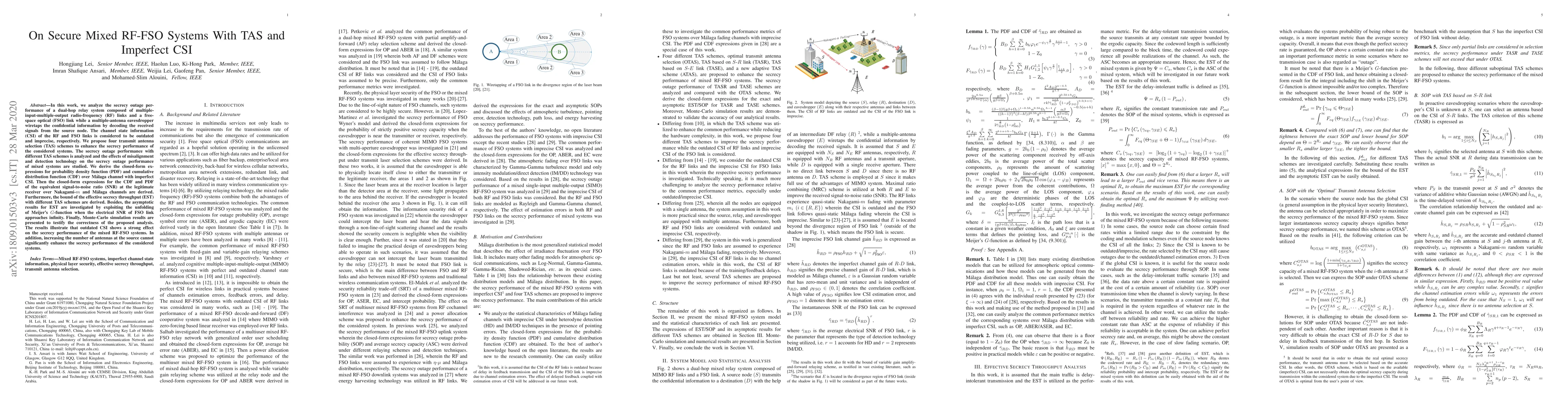 This paper analyzes the secrecy outage performance of a dual-hop relay system combining RF and FSO links, with a focus on transmit antenna selection (TAS) schemes under imperfect channel state information. It proposes three TAS schemes and derives closed-form expressions for the probability density and cumulative distribution functions, demonstrating the impact of outdated CSI and antenna count on secrecy performance.
