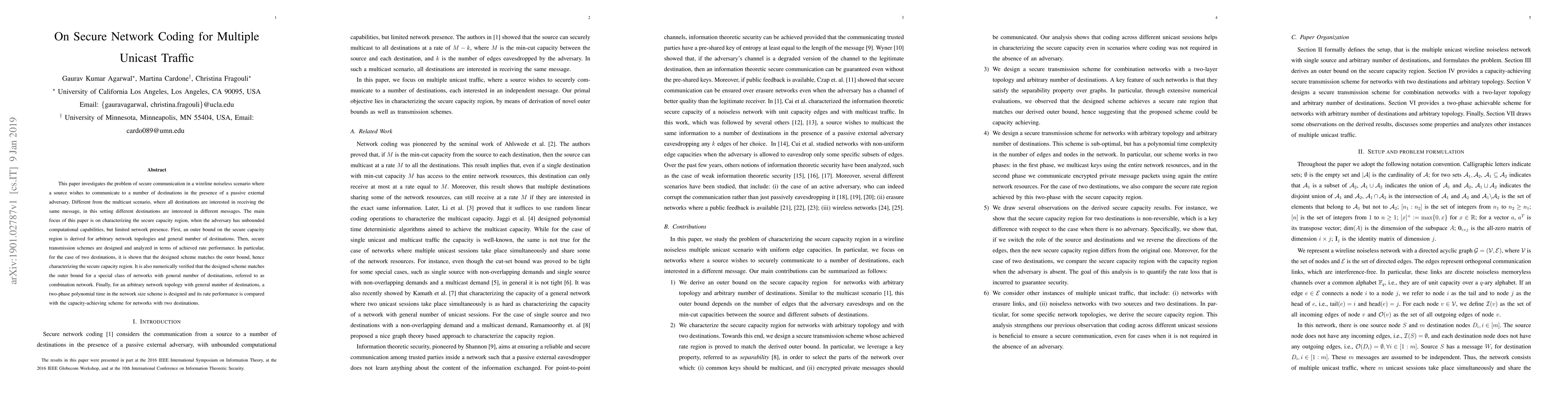 This paper investigates the problem of secure communication in a wireline noiseless scenario where a source wishes to communicate to a number of destinations in the presence of a passive external adversary. Different from the multicast scenario, where all destinations are interested in receiving the same message, in this setting different destinations are interested in different messages. The main focus of this paper is on characterizing the secure capacity region, when the adversary has unbounded computational capabilities, but limited network presence. First, an outer bound on the secure capacity region is derived for arbitrary network topologies and general number of destinations. Then, secure transmission schemes are designed and analyzed in terms of achieved rate performance. In particular, for the case of two destinations, it is shown that the designed scheme matches the outer bound, hence characterizing the secure capacity region. It is also numerically verified that the designed scheme matches the outer bound for a special class of networks with general number of destinations, referred to as combination network. Finally, for an arbitrary network topology with general number of destinations, a two-phase polynomial time in the network size scheme is designed and its rate performance {is} compared with the capacity-achieving scheme for networks with two destinations.