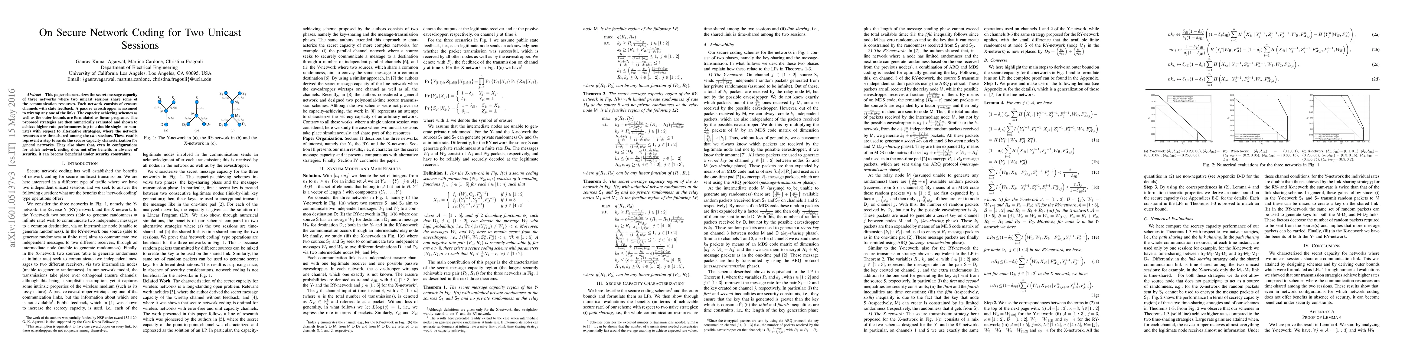 This paper characterizes the secret message capacity of three networks where two unicast sessions share some of the communication resources. Each network consists of erasure channels with state feedback. A passive eavesdropper is assumed to wiretap any one of the links. The capacity achieving schemes as well as the outer bounds are formulated as linear programs. The proposed strategies are then numerically evaluated and shown to achieve higher rate performances (up to a double single- or sum-rate) with respect to alternative strategies, where the network resources are time-shared among the two sessions. These results represent a step towards the secure capacity characterization for general networks. They also show that, even in configurations for which network coding does not offer benefits in absence of security, it can become beneficial under security constraints.