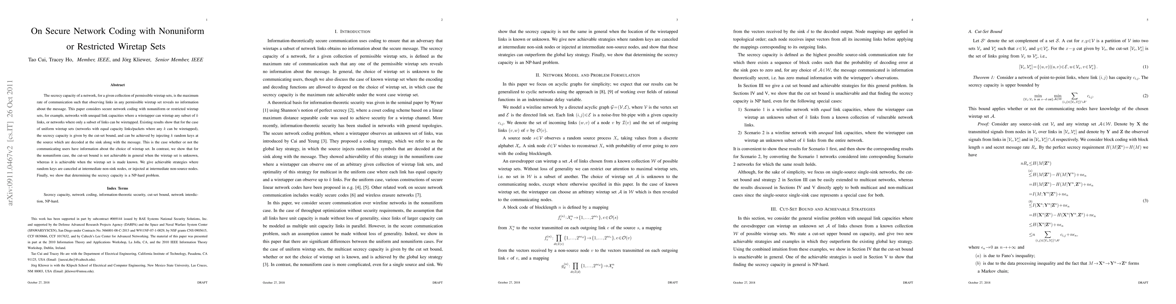 This paper investigates secure network coding in networks with nonuniform or restricted wiretap sets, demonstrating that the cut-set bound for secrecy capacity is not generally achievable when the wiretap set is unknown, unlike in uniform cases. It proposes strategies for achieving the bound when the wiretap set is known and highlights the NP-hardness of determining the secrecy capacity.