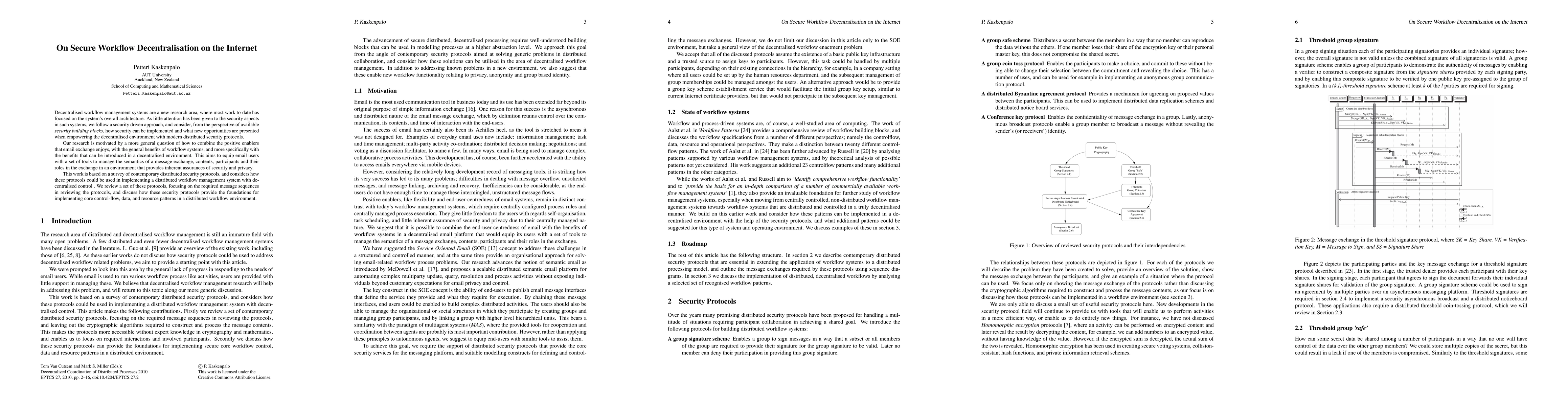 Decentralised workflow management systems are a new research area, where most work to-date has focused on the system's overall architecture. As little attention has been given to the security aspects in such systems, we follow a security driven approach, and consider, from the perspective of available security building blocks, how security can be implemented and what new opportunities are presented when empowering the decentralised environment with modern distributed security protocols. Our research is motivated by a more general question of how to combine the positive enablers that email exchange enjoys, with the general benefits of workflow systems, and more specifically with the benefits that can be introduced in a decentralised environment. This aims to equip email users with a set of tools to manage the semantics of a message exchange, contents, participants and their roles in the exchange in an environment that provides inherent assurances of security and privacy. This work is based on a survey of contemporary distributed security protocols, and considers how these protocols could be used in implementing a distributed workflow management system with decentralised control . We review a set of these protocols, focusing on the required message sequences in reviewing the protocols, and discuss how these security protocols provide the foundations for implementing core control-flow, data, and resource patterns in a distributed workflow environment.