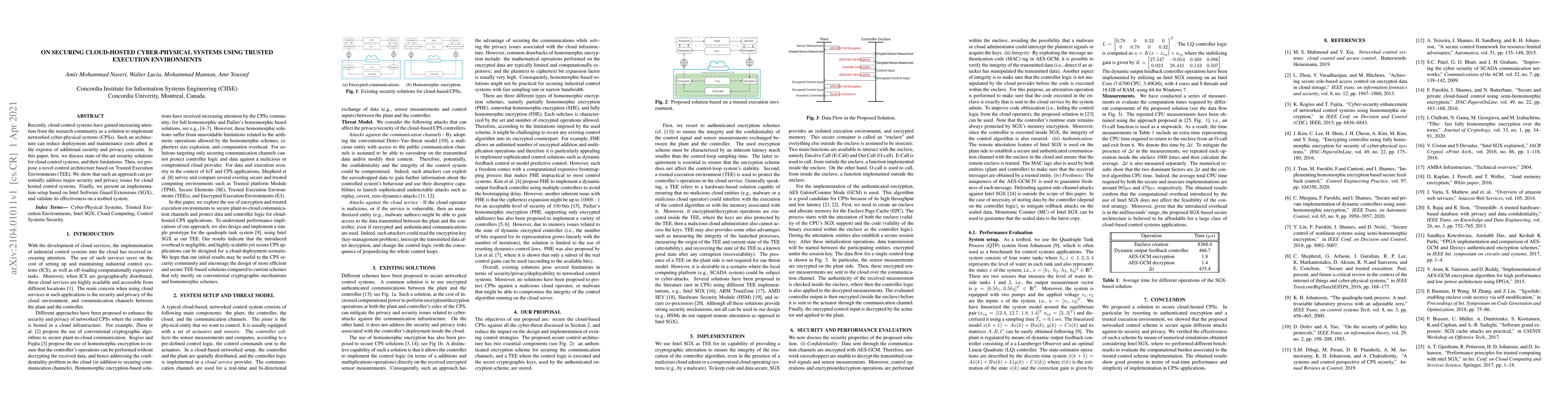 This paper reviews current security solutions for cloud-hosted cyber-physical systems, highlighting their limitations. It proposes a novel architecture leveraging Trusted Execution Environments to enhance security and privacy, validated through an implementation using Intel SGX on a testbed system.