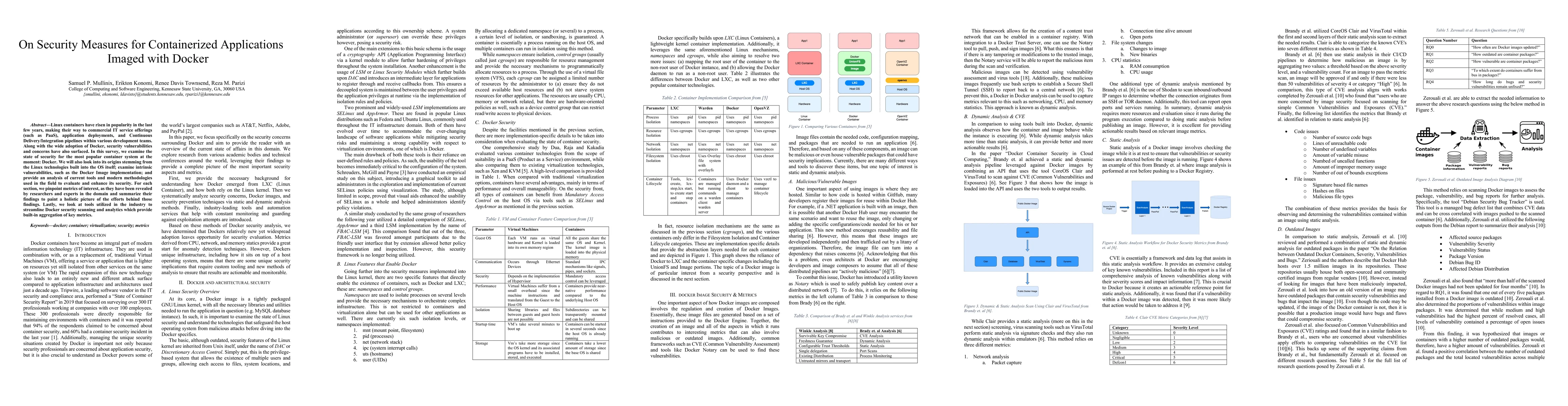 This paper surveys the security measures for Docker containerized applications, analyzing intrinsic vulnerabilities, current tools, and methodologies used to enhance security, and summarizing industry tools for Docker security scanning and analytics.