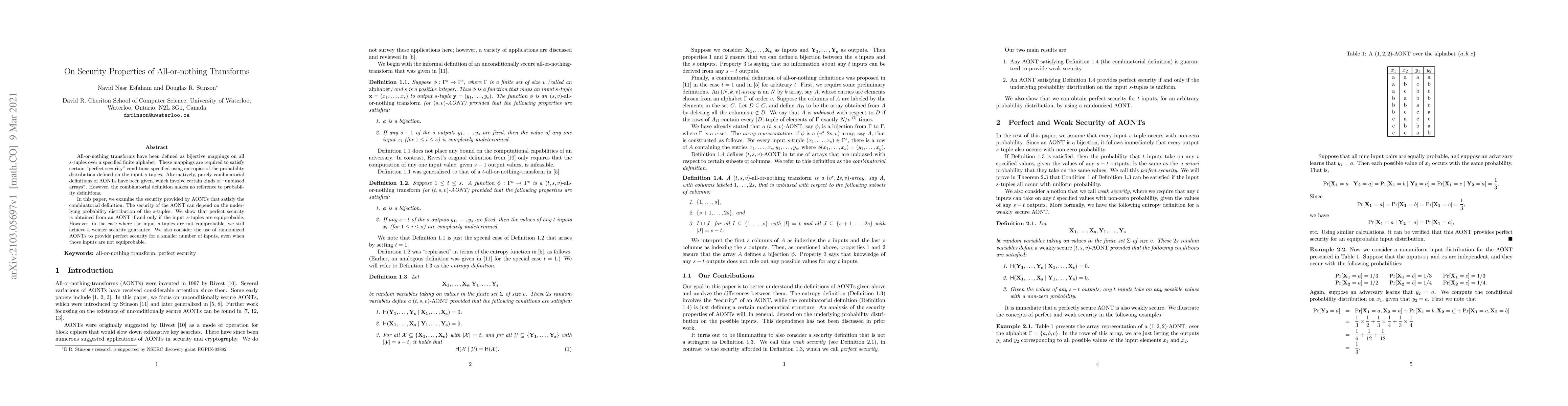 The paper examines the security properties of all-or-nothing transforms (AONTs) using both probabilistic and combinatorial definitions, demonstrating conditions under which AONTs provide perfect security.