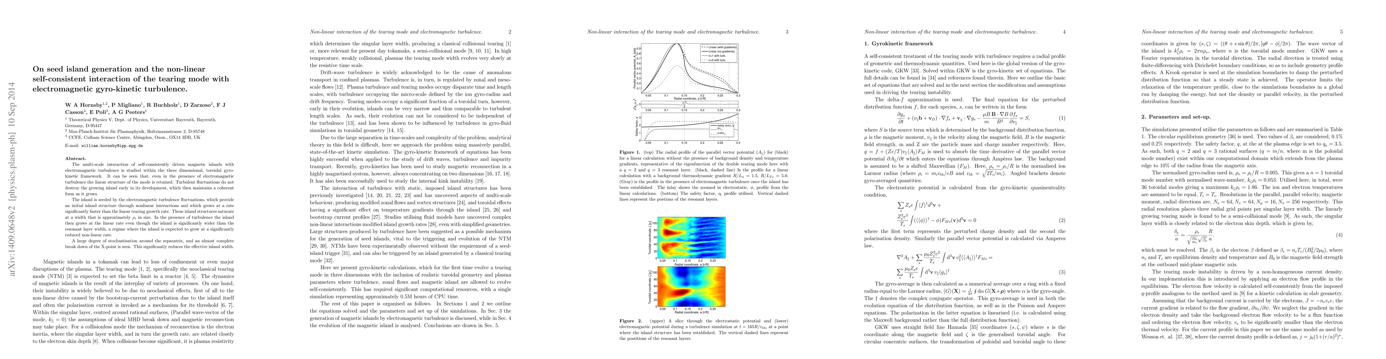 The multi-scale interaction of self-consistently driven magnetic islands with electromagnetic turbulence is studied within the three dimensional, toroidal gyro-kinetic framework. It can be seen that, even in the presence of electromagnetic turbulence the linear structure of the mode is retained. Turbulent fluctuations do not destroy the growing island early in its development, which then maintains a coherent form as it grows. The island is seeded by the electromagnetic turbulence fluctuations, which provide an initial island structure through nonlinear interactions and which grows at a rate significantly faster than the linear tearing growth rate. These island structures saturate at a width that is approximately $\rho_{i}$ in size. In the presence of turbulence the island then grows at the linear rate even though the island is significantly wider than the resonant layer width, a regime where the island is expected to grow at a significantly reduced non-linear rate. A large degree of stochastisation around the separatrix, and an almost complete break down of the X-point is seen. This significantly reduces the effective island width.