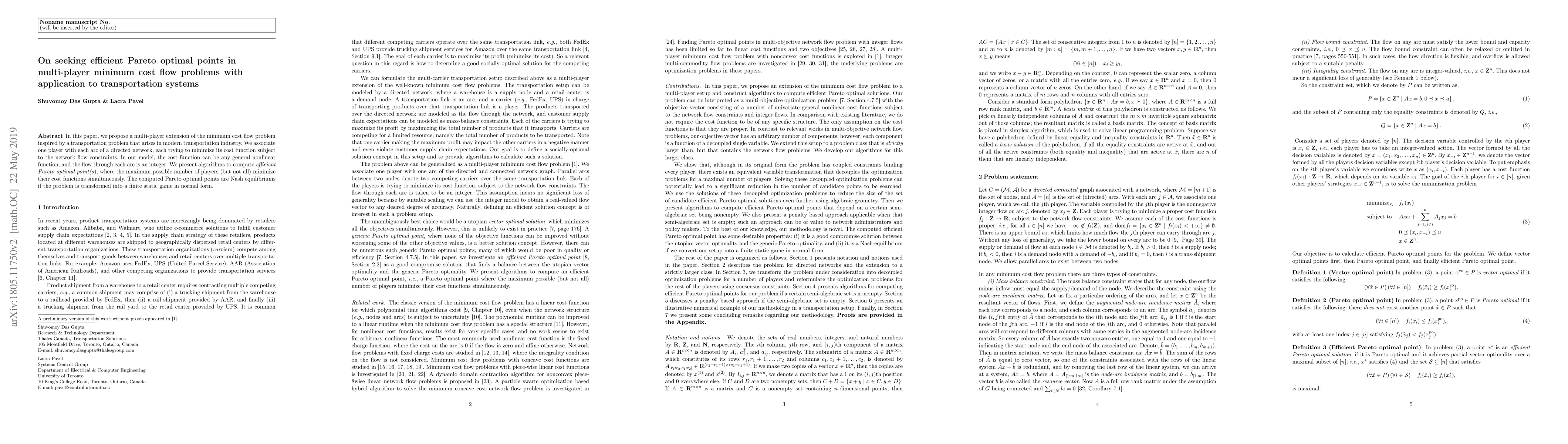 This paper extends the minimum cost flow problem to a multi-player context, where each player aims to minimize their cost function subject to network flow constraints. Algorithms are presented to find efficient Pareto optimal points, representing Nash equilibria in a transformed finite static game, applicable to modern transportation systems.