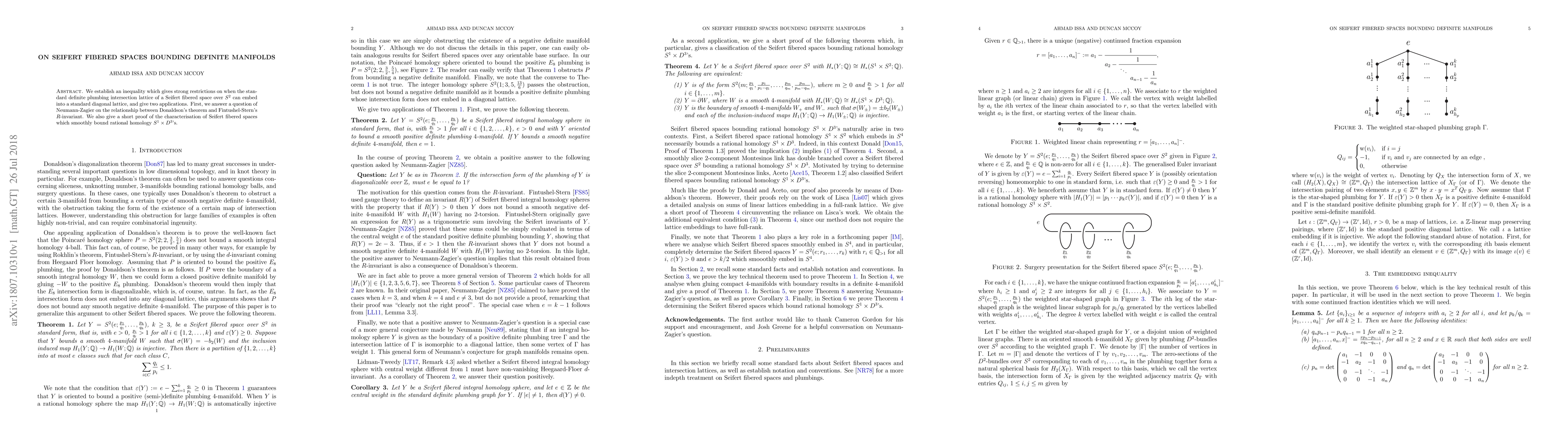 This paper establishes an inequality restricting when the intersection lattice of a Seifert fibered space can embed into a diagonal lattice, addressing a Neumann-Zagier question about the relationship between Donaldson's theorem and Fintushel-Stern's $R$-invariant, and providing a proof for Seifert fibered spaces bounding rational homology $S^1 \times D^3$'s.