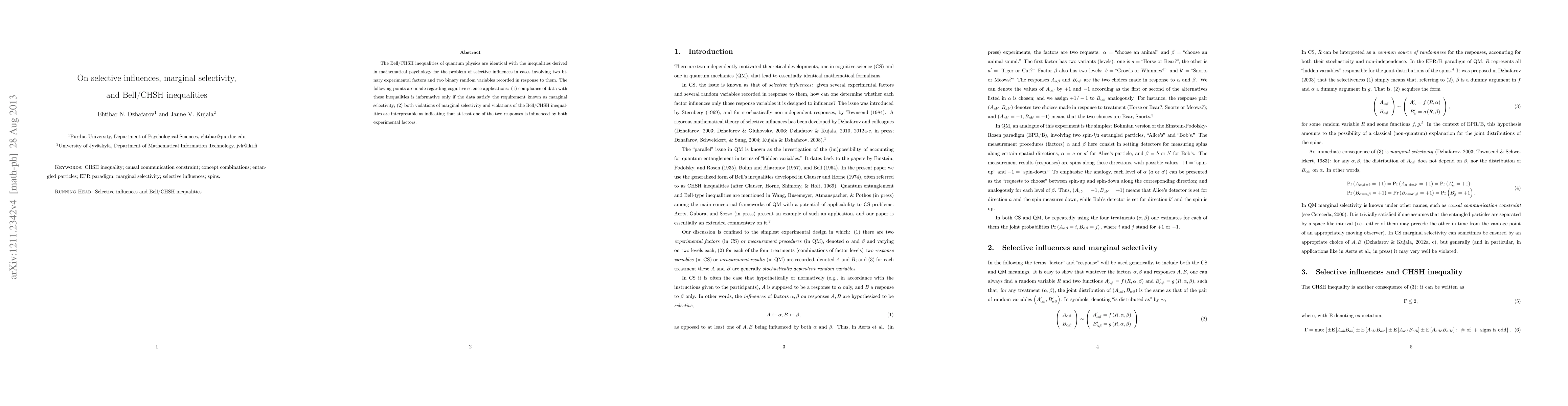 This research demonstrates that the Bell/CHSH inequalities from quantum physics parallel those derived in mathematical psychology for selective influences. It highlights that data compliance with these inequalities is meaningful only if marginal selectivity is met, and both its violation and the Bell/CHSH inequalities' violations suggest at least one response is influenced by both experimental factors.