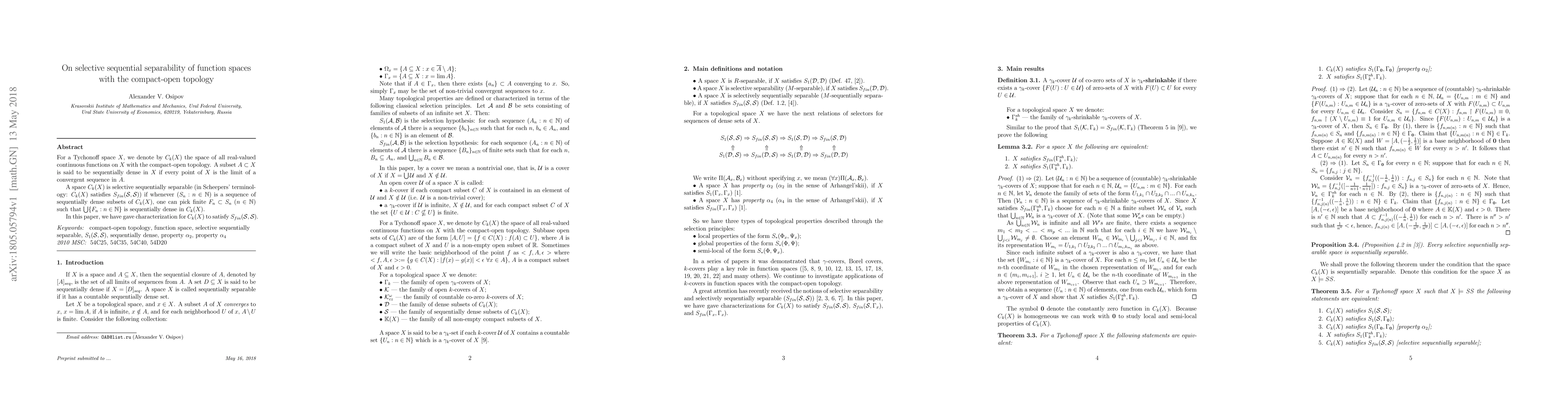 This paper characterizes the space $C_k(X)$ of real-valued continuous functions on a Tychonoff space $X$ with the compact-open topology to satisfy $S_{fin}(S, S)$, a form of selective sequential separability. The findings provide insight into the topological properties of function spaces under this topology.
