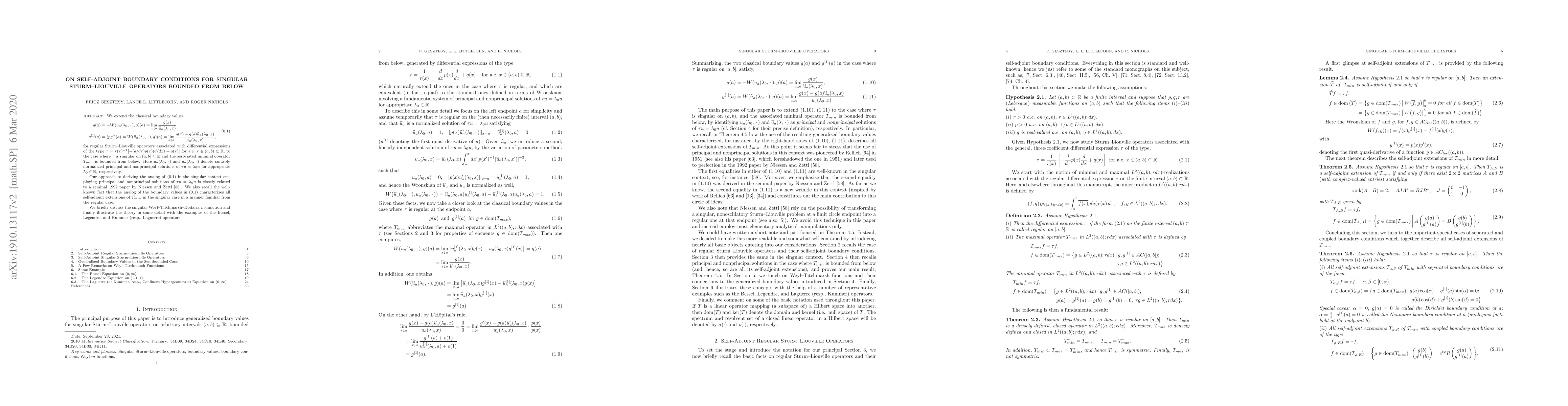 We extend the classical boundary values \begin{align*} & g(a) = - W(u_{a}(\lambda_0,.), g)(a) = \lim_{x \downarrow a} \frac{g(x)}{\hat u_{a}(\lambda_0,x)}, \\ &g^{[1]}(a) = (p g')(a) = W(\hat u_{a}(\lambda_0,.), g)(a) = \lim_{x \downarrow a} \frac{g(x) - g(a) \hat u_{a}(\lambda_0,x)}{u_{a}(\lambda_0,x)} \end{align*} for regular Sturm-Liouville operators associated with differential expressions of the type $\tau = r(x)^{-1}[-(d/dx)p(x)(d/dx) + q(x)]$ for a.e. $x\in[a,b] \subset \mathbb{R}$, to the case where $\tau$ is singular on $(a,b) \subseteq \mathbb{R}$ and the associated minimal operator $T_{min}$ is bounded from below. Here $u_a(\lambda_0, \cdot)$ and $\hat u_a(\lambda_0, \cdot)$ denote suitably normalized principal and nonprincipal solutions of $\tau u = \lambda_0 u$ for appropriate $\lambda_0 \in \mathbb{R}$, respectively. We briefly discuss the singular Weyl-Titchmarsh-Kodaira $m$-function and finally illustrate the theory in some detail with the examples of the Bessel, Legendre, and Kummer (resp., Laguerre) operators.