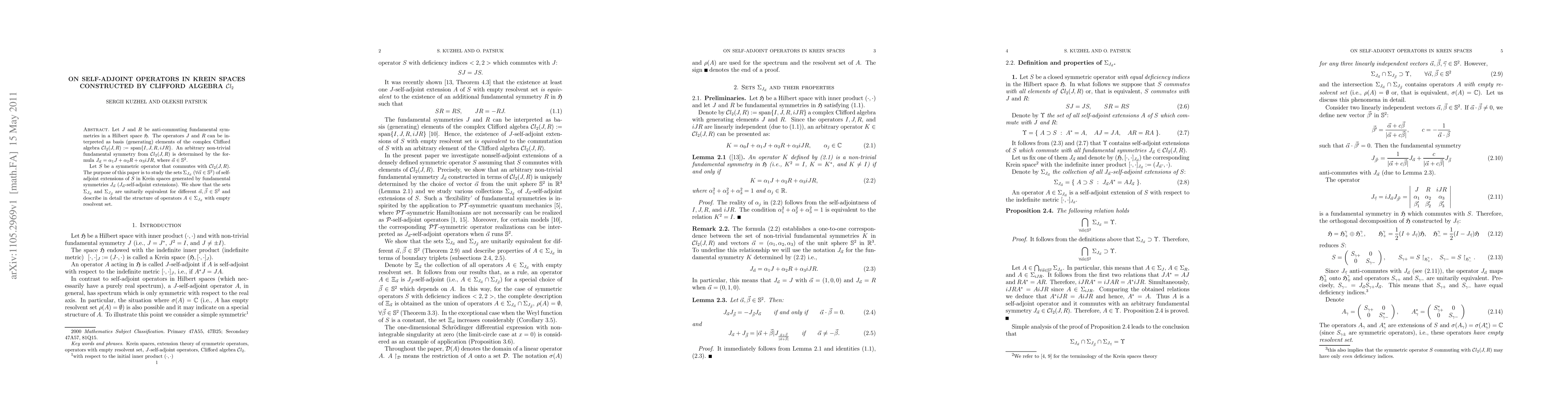 This paper investigates self-adjoint extensions of symmetric operators in Krein spaces generated by Clifford algebra ${\mathcal C}l_2(J,R)$. It demonstrates that these extensions are unitarily equivalent across different generating symmetries and provides a detailed structural analysis of operators with empty resolvent sets.