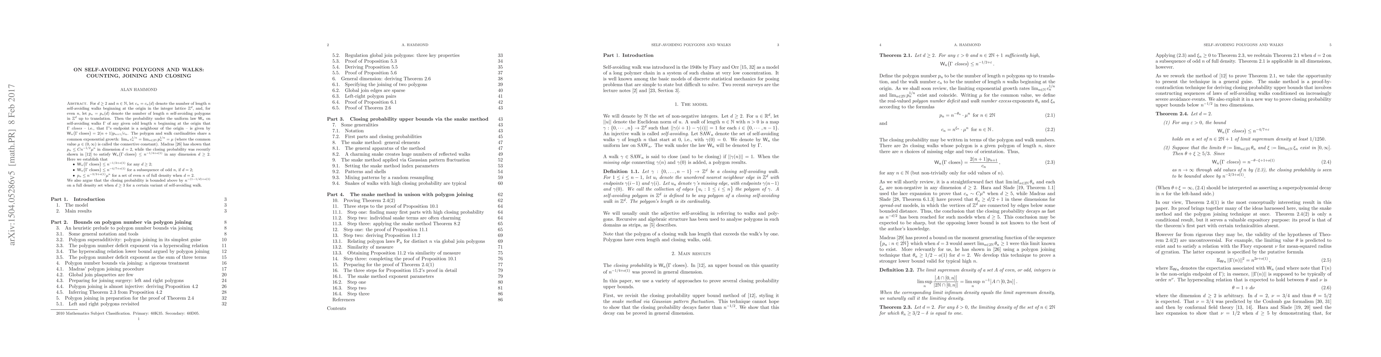 For d at least two and integer n, let c_n = c_n(d) denote the number of length n self-avoiding walks beginning at the origin in the integer lattice Z^d, and, for even n, let p_n = p_n(d) denote the number of length n self-avoiding polygons in Z^d up to translation. Then the probability under the uniform law W_n on self-avoiding walks Gamma of any given odd length n beginning at the origin that Gamma closes -- i.e., that Gamma's endpoint is a neighbour of the origin -- is given by W_n ( Gamma closes ) = 2(n+1) p_{n+1}/c_n. The polygon and walk cardinalities share a common exponential growth: lim_n c_n^{1/n} = lim_{n even} p_n^{1/n} = mu (where the common value mu is called the connective constant). Madras [26] has shown that p_n is at most C n^{-1/2} mu^n in dimension d=2, while the closing probability was recently shown in [12] to satisfy W_n ( Gamma closes ) is at most n^{-1/4 + o(1)} in any dimension d at least two. Here we establish that (1) W_n ( Gamma closes ) is at most n^{-1/2 + o(1)} for any d at least two; (2) W_n ( Gamma closes ) is at most n^{-4/7 + o(1)} for a subsequence of odd n, if d = 2; and (3) p_n is at most n^{-3/2 + o(1)} mu^n for a set of even n of full density when d=2. We also argue that the closing probability is bounded above by n^{-(1 - 1/d) + o(1)} on a full density set when d is at least three for a certain variant of self-avoiding walk.