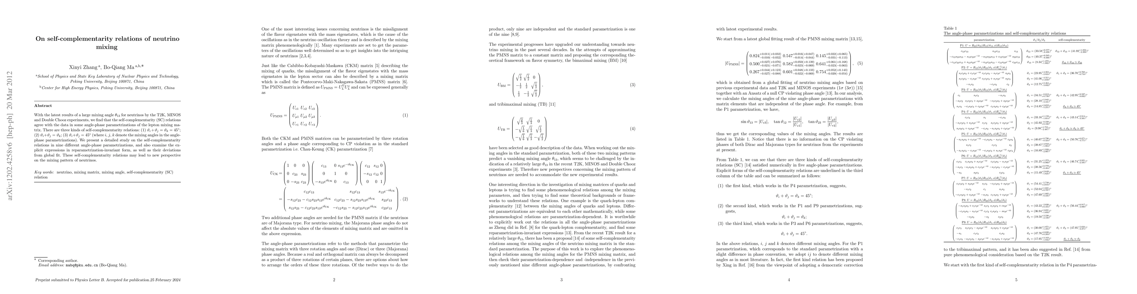 This paper investigates self-complementarity relations among neutrino mixing angles, finding agreement with experimental data from T2K, MINOS, and Double Chooz. It explores three types of SC relations and examines their implications in various parametrizations, suggesting they may offer new insights into neutrino mixing patterns.