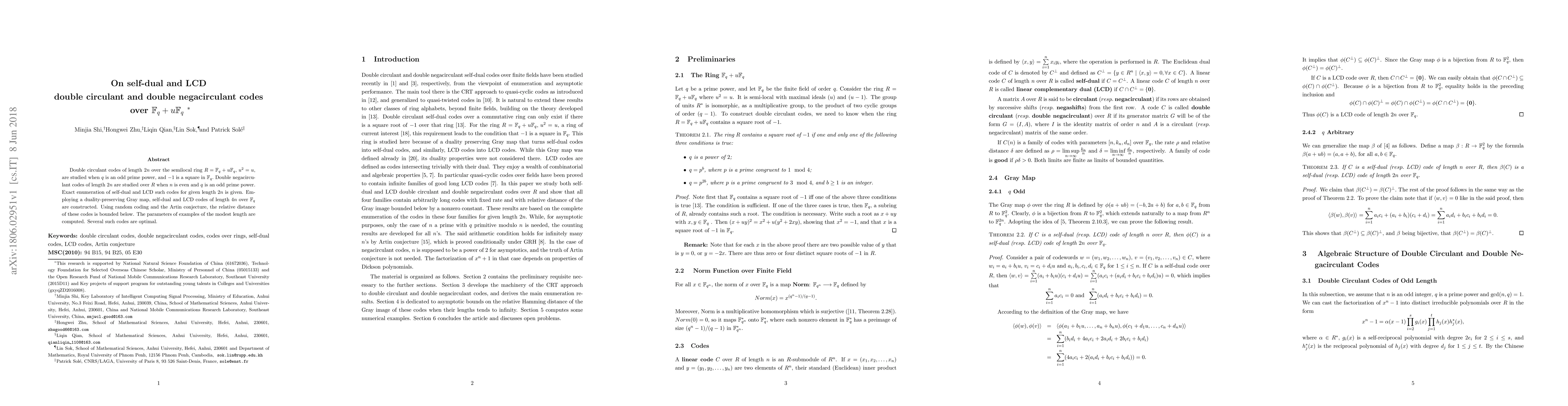 Double circulant codes of length $2n$ over the semilocal ring $R = \mathbb{F}_q + u\mathbb{F}_q,\, u^2=u,$ are studied when $q$ is an odd prime power, and $-1$ is a square in $\mathbb{F}_q.$ Double negacirculant codes of length $2n$ are studied over $R$ when $n$ is even and $q$ is an odd prime power. Exact enumeration of self-dual and LCD such codes for given length $2n$ is given. Employing a duality-preserving Gray map, self-dual and LCD codes of length $4n$ over $\mathbb{F}_q$ are constructed. Using random coding and the Artin conjecture, the relative distance of these codes is bounded below. The parameters of examples of the modest length are computed. Several such codes are optimal.