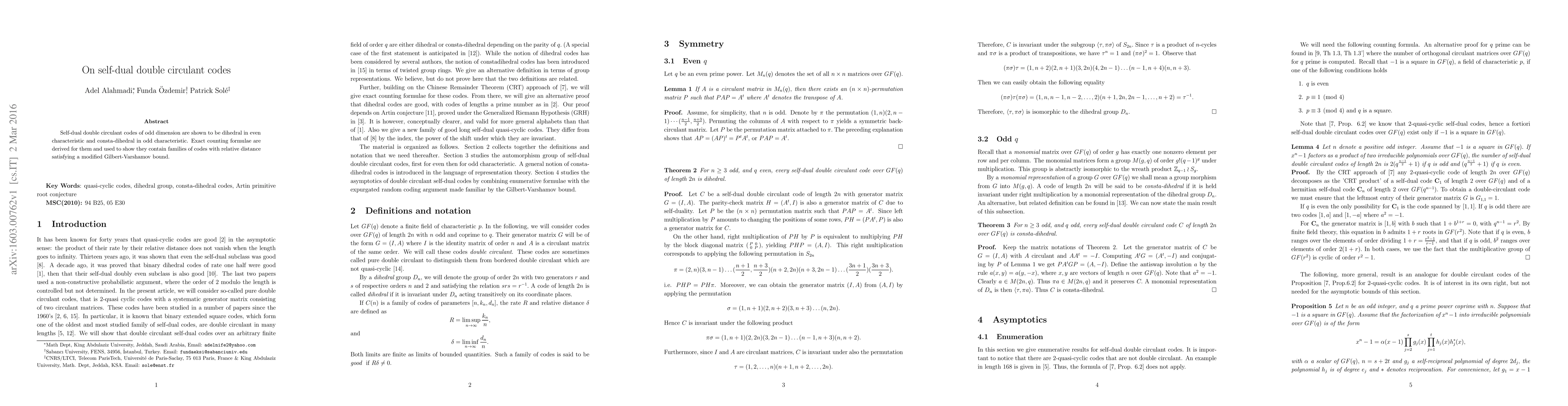 Summary: This paper demonstrates that self-dual double circulant codes of odd dimension are dihedral in even characteristic and consta-dihedral in odd characteristic, providing exact counting formulae and showing they meet a modified Gilbert-Varshamov bound for relative distance.