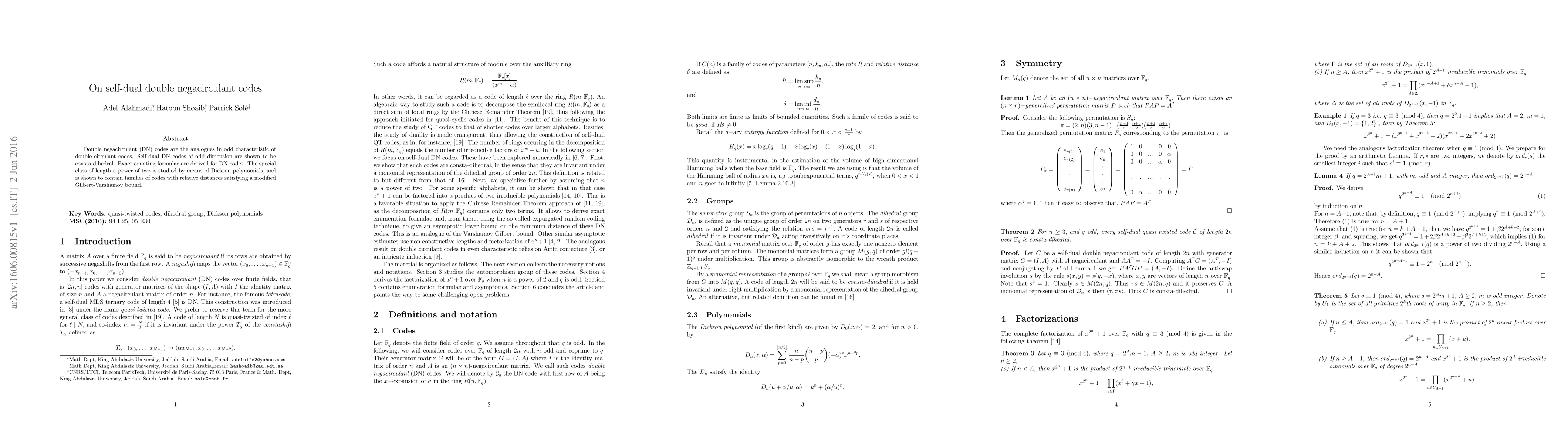 This paper explores self-dual double negacirculant (DN) codes in odd characteristic, proving they are consta-dihedral. It provides exact counting formulae for DN codes and examines codes of length a power of two, showing they meet a modified Gilbert-Varshamov bound.