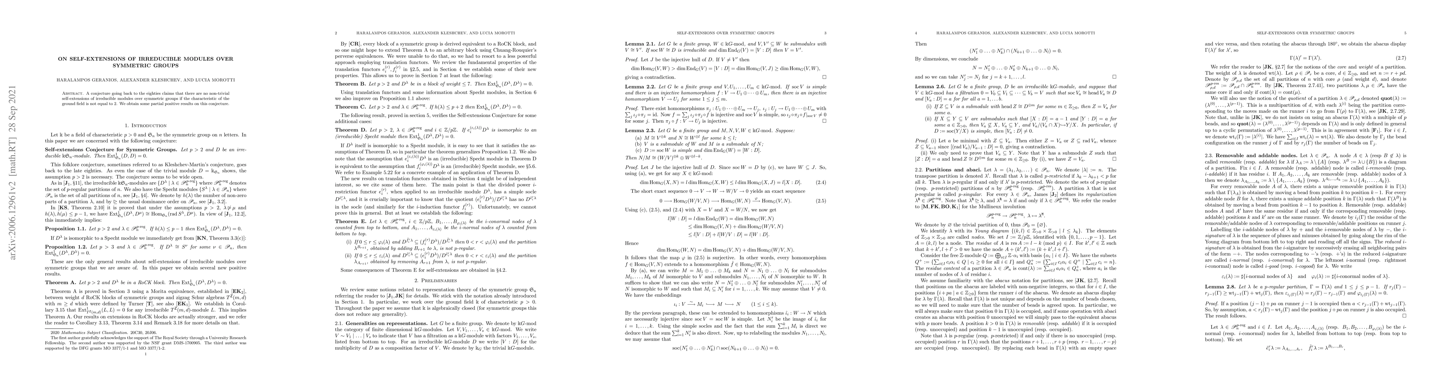 A conjecture going back to the eighties claims that there are no non-trivial self-extensions of irreducible modules over symmetric groups if the characteristic of the ground field is not equal to $2$. We obtain some partial positive results on this conjecture.