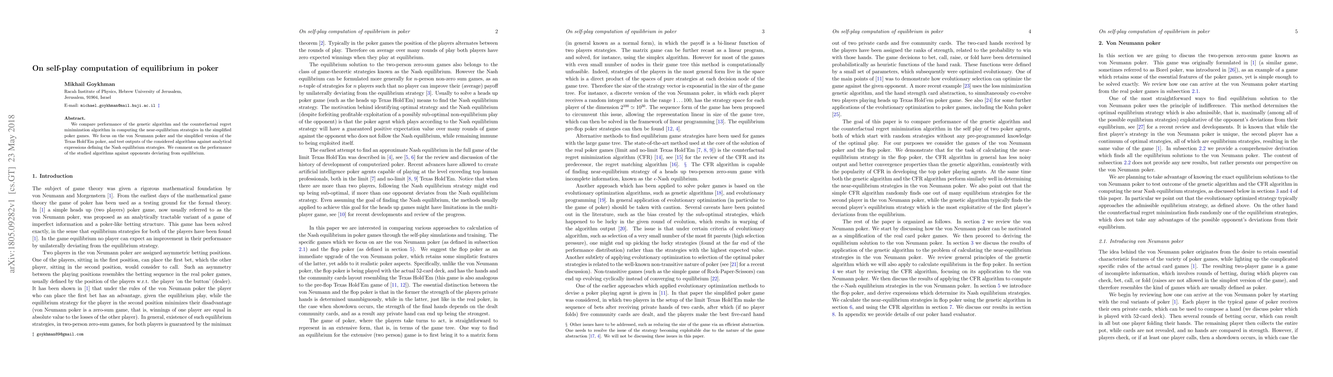 This paper compares genetic algorithms and counterfactual regret minimization in computing near-equilibrium strategies for simplified poker games, specifically von Neumann poker and a simplified Texas Hold'Em. The study evaluates the algorithms' outputs against analytical Nash equilibrium strategies and assesses their performance against non-equilibrium opponents.