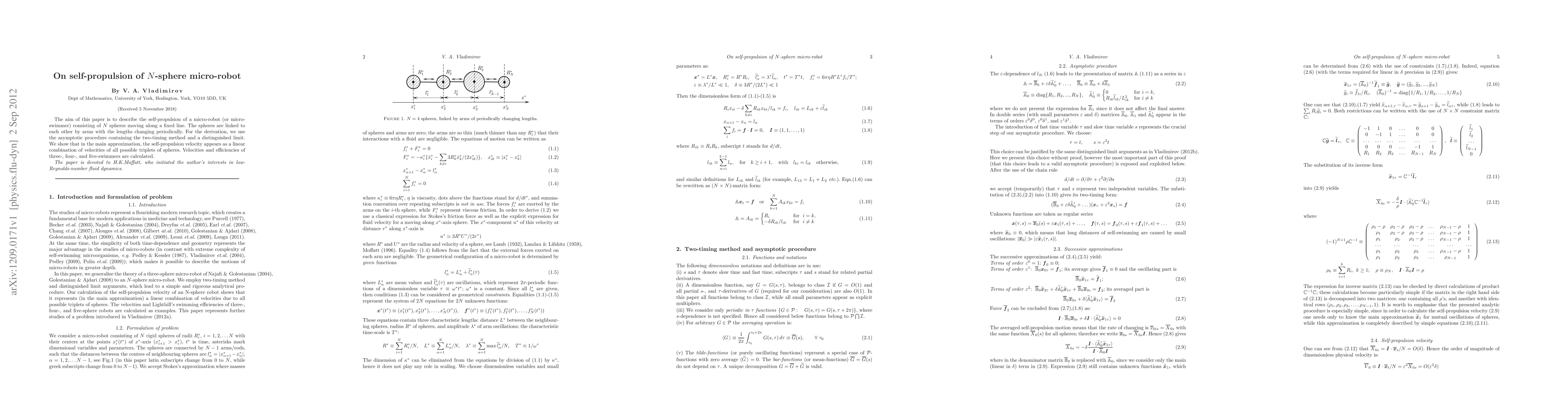 The aim of this paper is to describe the self-propulsion of a micro-robot (or micro-swimmer) consisting of $N$ spheres moving along a fixed line. The spheres are linked to each other by arms with the lengths changing periodically. For the derivation, we use the asymptotic procedure containing the two-timing method and a distinguished limit. We show that in the main approximation, the self-propulsion velocity appears as a linear combination of velocities of all possible triplets of spheres. Velocities and efficiencies of three-, four-, and five-swimmers are calculated. The paper is devoted to H.K.Moffatt, who initiated the author's interests in low-Reynolds-number fluid dynamics.