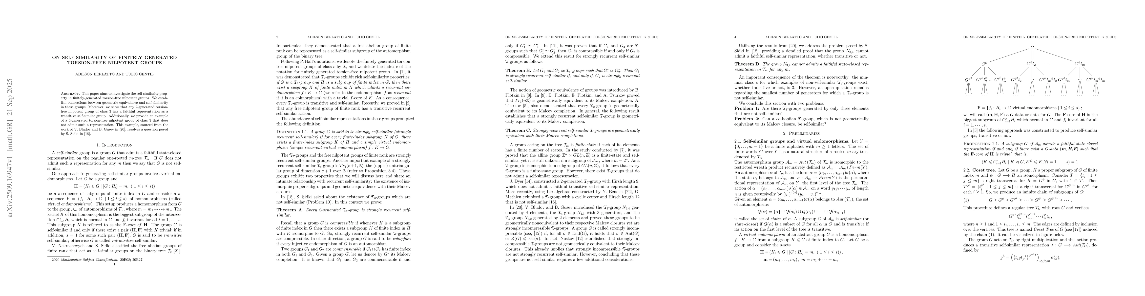 The paper employs a combination of algebraic group theory and virtual endomorphism analysis to study self-similarity properties of finitely generated torsion-free nilpotent groups. It uses Malcev completions, geometric equivalence, and structural properties of nilpotent groups to establish connections between self-similarity and other algebraic properties.